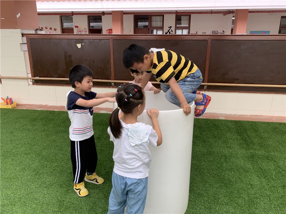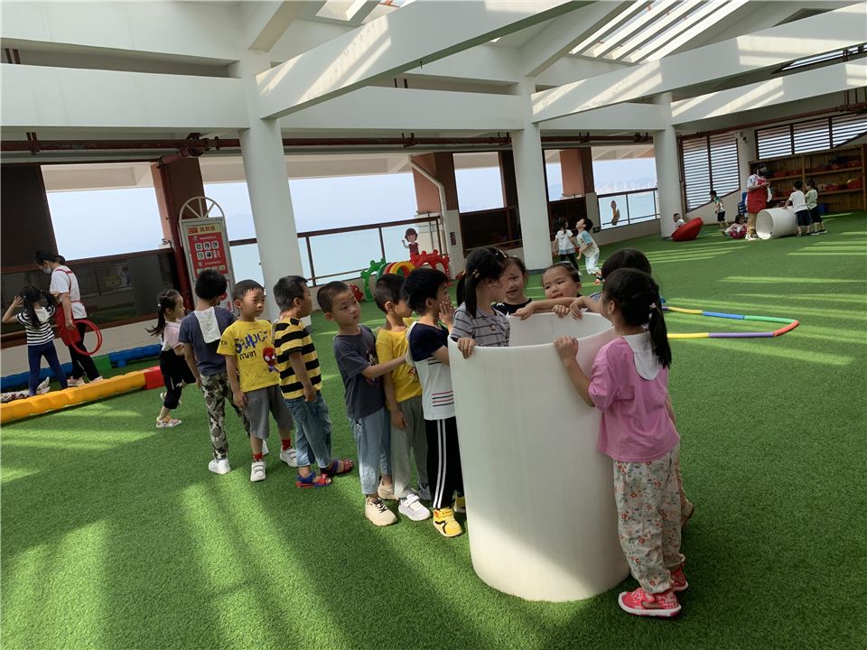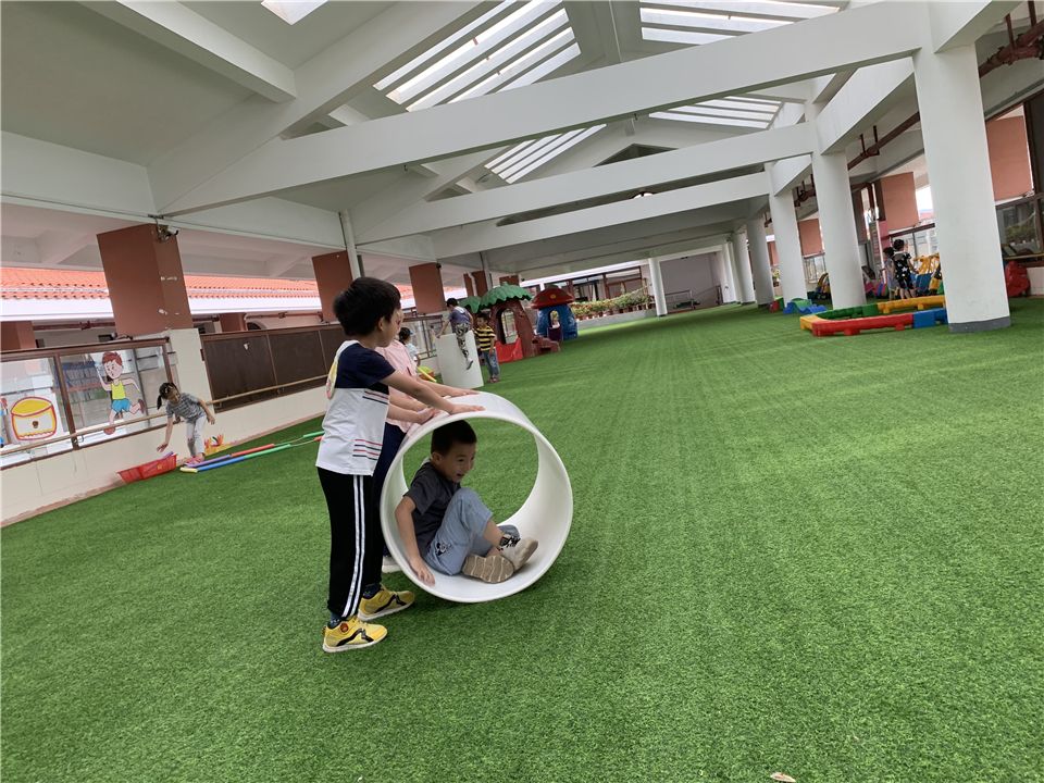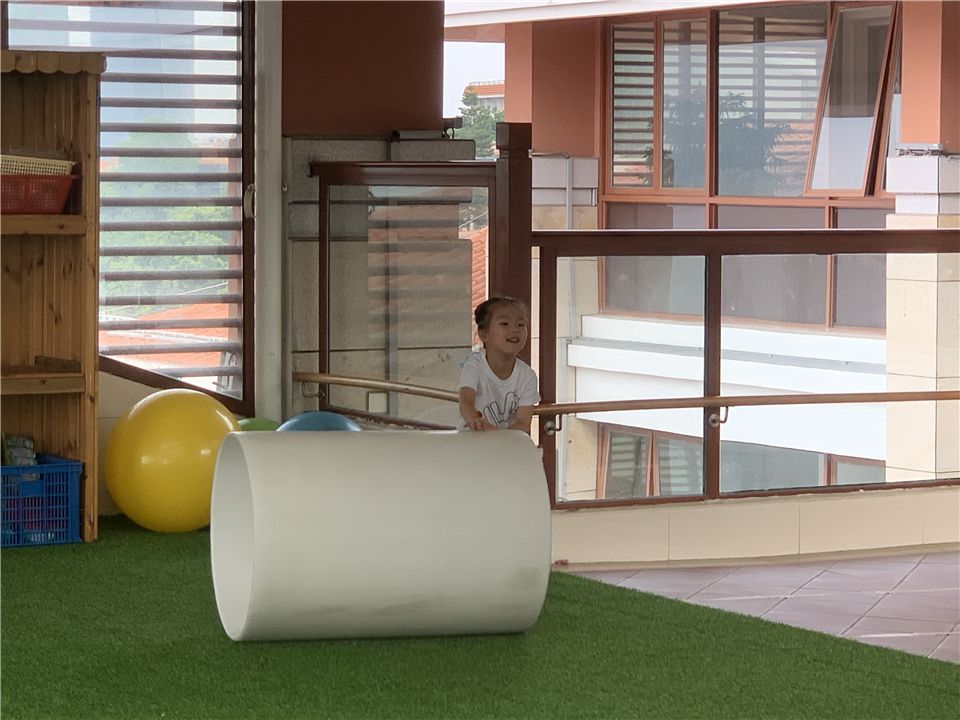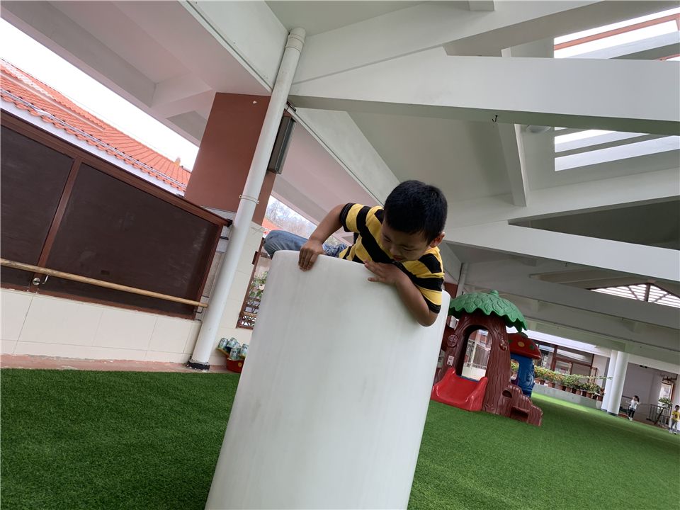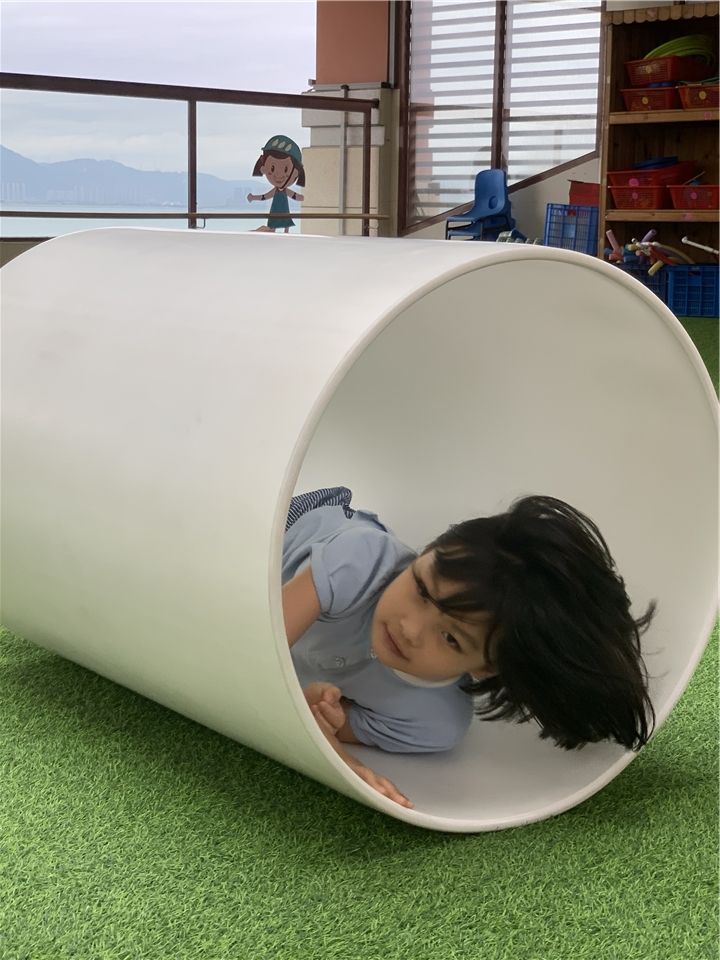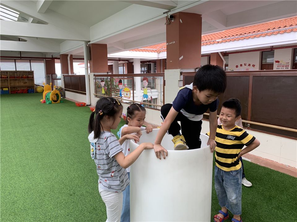 我们在天台户外运动场上与它近距离接触,这幼儿园最大号的管子特别的亮眼,是我们中四班宝贝近期特别热衷于挑战的一个运动器械。