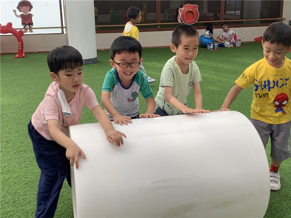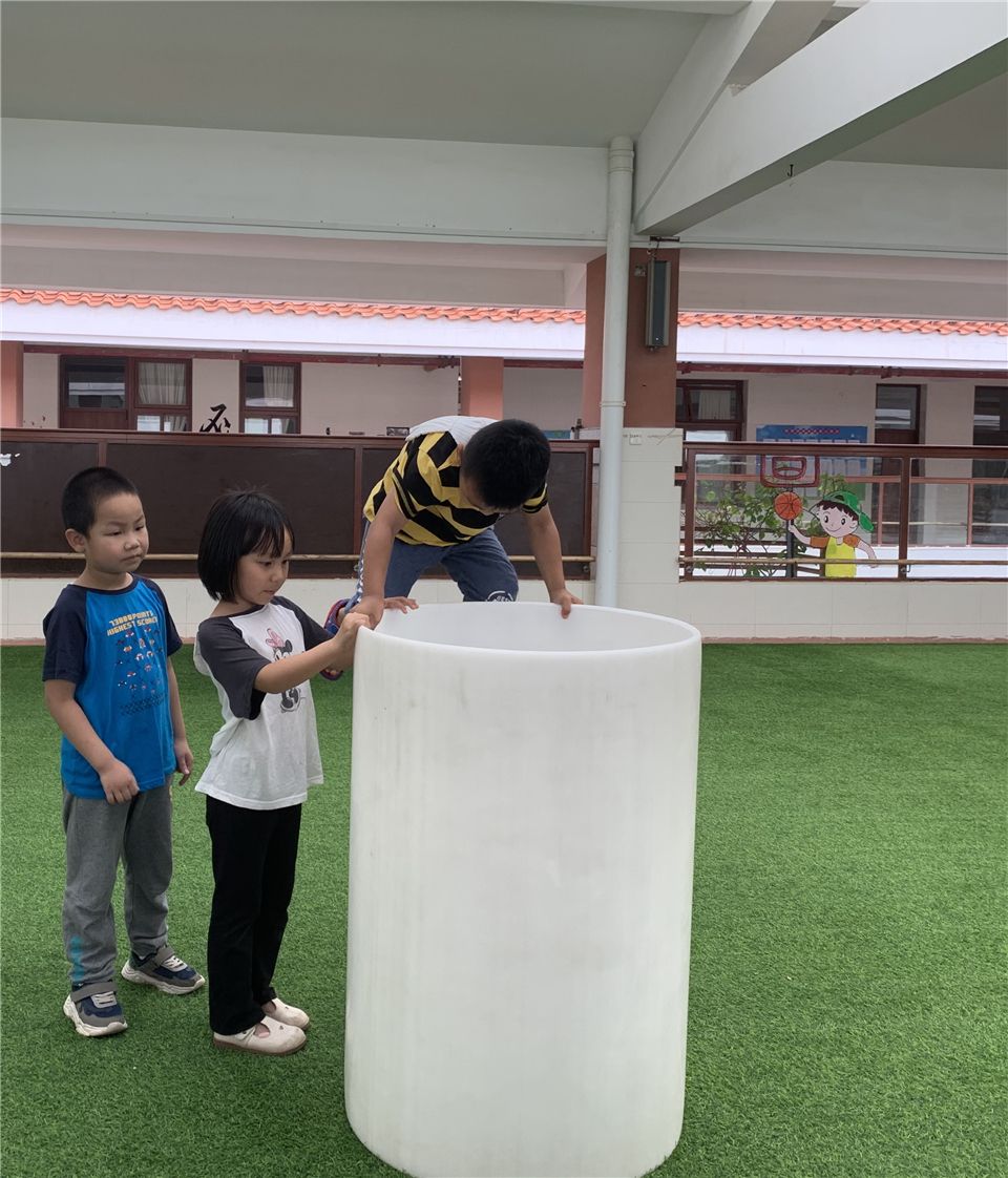 白色的大滚筒,又沉又重,怎么让它动起来呢?来,推推看!一人推不动,两人来!三人来!