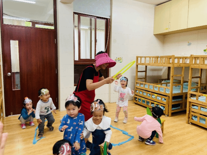 在欢乐的音乐游戏中,宝贝们通过观看视频、倾听音乐、分享交流了解小鱼游的方式,在渔夫捕捉小鱼的游戏环节中,锻炼了宝贝们躲藏、蹲下的能力,体验了与同伴游戏的快乐。