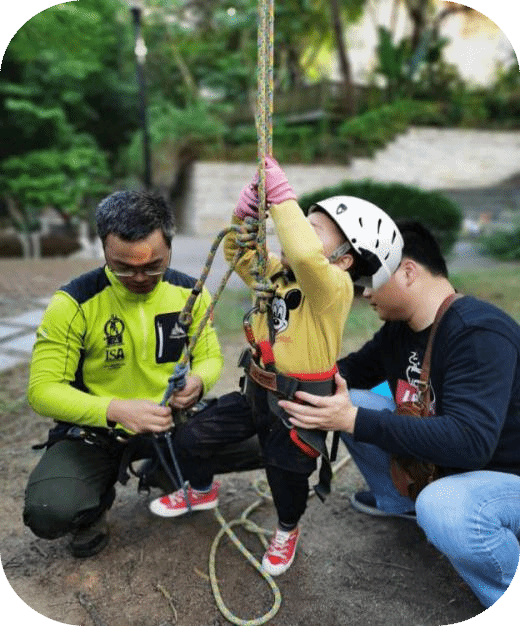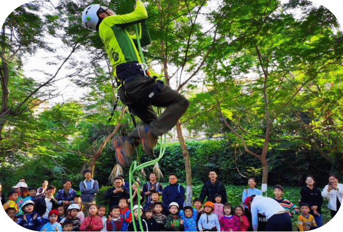 “爬树”运动是一种惊险刺激、挑战性的户外运动项目,通过穿戴安全装备,以特有的器械和绳索,运用上升下降的技术、切换技术攀爬各种不同的树木,小朋友们亲近大自然,尽情地享乐其中;懂得树木和人类一样都会感觉到“痛”,增强了保护树木的意识。同时,也极好地锻炼了小朋友们勇敢、坚毅的品格。