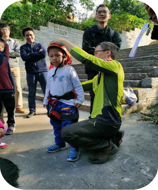 小朋友们非常的好奇,那到底什么样的树适合攀爬呢?“健康又开心的树才是适合爬树活动的哦。”在骆老师的介绍下,小朋友终于知道了什么样的树是“健康”且“开心”的,骆老师再次介绍了安全帽、安全坐带的重要性和使用方法,边讲解边示范了爬树的动作要领。