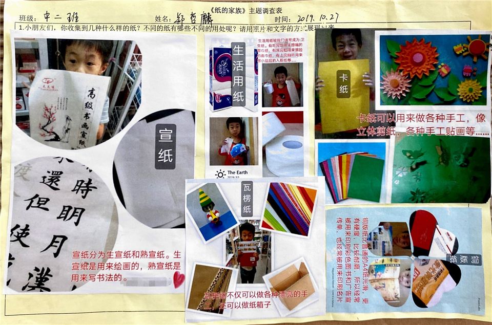 孩子是天生的探索家,他们总是带着一颗不断探究的好奇心,去了解这世界神奇的一切!生活中随处可得的纸成为了他们探索的宝贝。在一次的美术活动中,芮芮说:“我见过锡纸,妈妈告诉我锡纸可以做烧烤。”源源:“我知道宣纸,它可以用来写毛笔纸字、画画,爸爸经常在宣纸上写好看的纸。”在这个过程中,孩子们产生了一个新的话题:“纸从哪里来?”借此抓住教育契机,立足幼儿兴趣,围绕“纸”开展一系列生成课程,既满足幼儿对纸的兴趣,又在这个活动中构建了对纸的特性及制造的新经验,于是一场别开生面的“纸趣”之旅应运而生。
