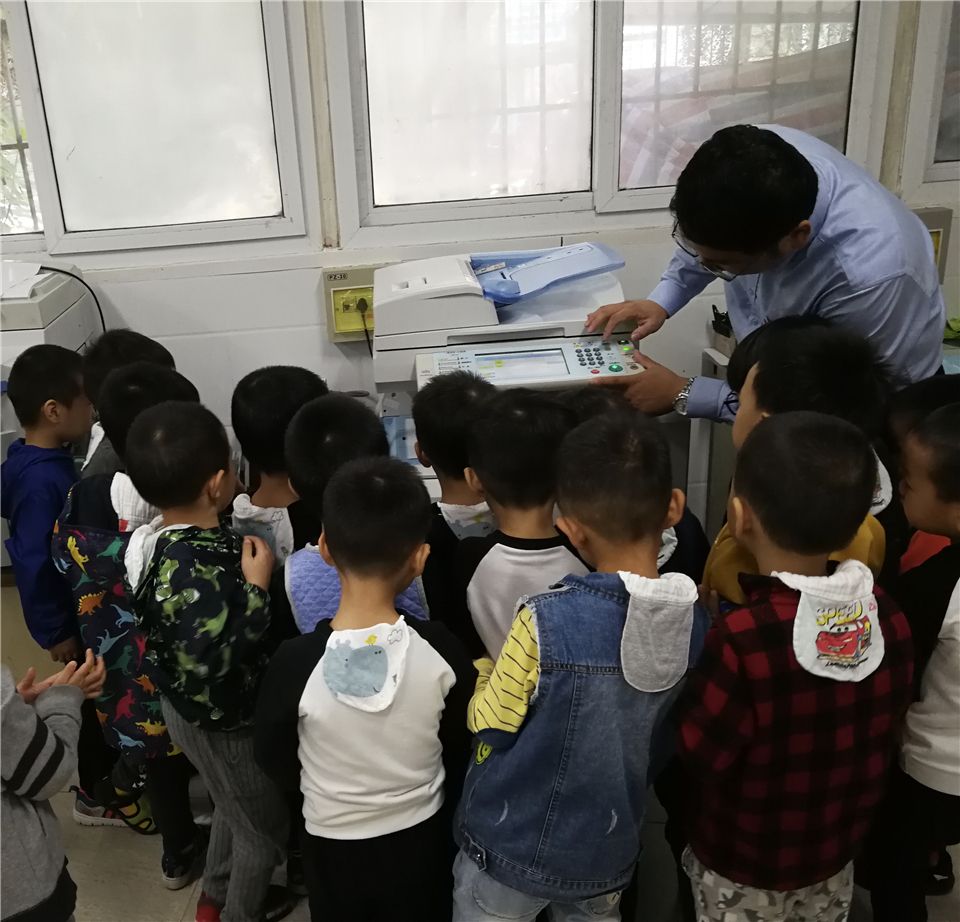 印刷厂的周叔叔带孩子参观了工人叔叔是怎样装订试卷?厦大莘莘学子大学生哥哥姐姐的毕业证书是如何印出来的?罗曼小朋友问到“周叔叔,那这些机器能造出新的纸吗?”“这台很大的机器是什么?”周叔叔没有马上回答他们的问题,而是故作神秘地问:“小朋友,如果你们把画好的画放进这个机器, 你们知道会发生什么事吗?”孩子们一个个都跃跃欲试,于是孩子们就拿起笔画他们喜欢的图案,周叔叔手把手的教他们操作几遍,一幅幅一模一样的作品就印刷出来了。趁这个时候,我问孩子们,“这速印机能造出新的纸吗?“不行,这张纸是老师放进去的,本来就有了。”“速印机只能复印,能变出双胞胎!”孩子们对于这个问题豁然开朗!