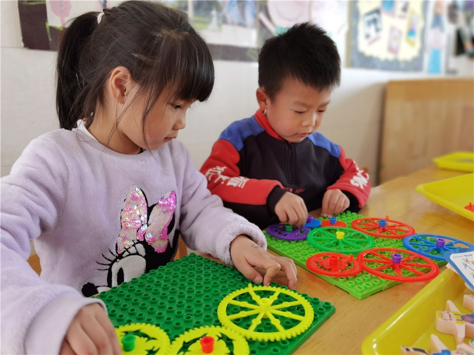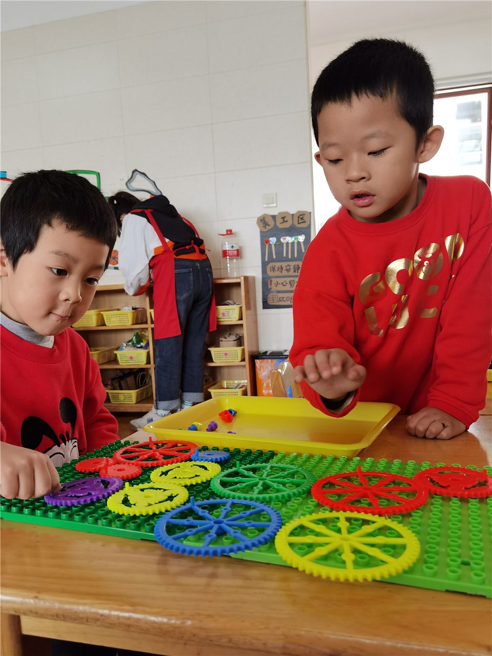 今天伊锘和洋洋几个小朋友来到了科学区,科学区里的齿轮玩具是他们最喜欢的操作材料之一,对他来说也具有一定的挑战性,如何让所有的齿轮转起来,可不是一件简单的事情哦。只见他们先把一个大齿轮固定在底板上,然后拿起另一个齿轮不时变换着位置,边操作边细心地观察着,以便让两个齿轮的“牙齿”镶嵌在一起,也只有做到这一点,底板上所有的齿轮才能一起转动起来。一旁的郑好边数边惊奇地说着:“哇,一共有九个齿轮转起来啦。”看着转动起来的齿轮,小伙伴的脸上露出了自信的笑容。