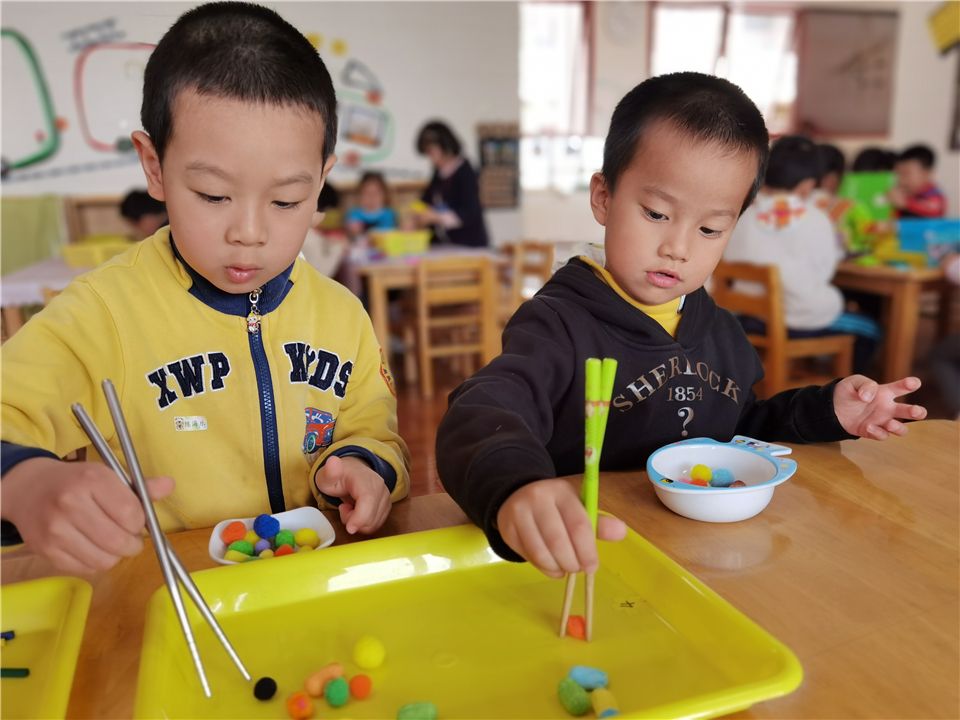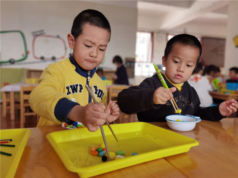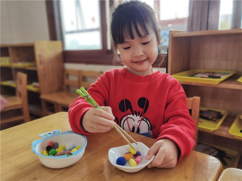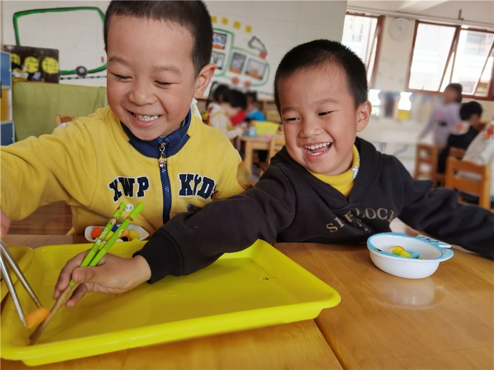 筷子是小朋友们熟悉的用餐工具,如何熟练使用筷子是这段时间区域里小朋友们最热衷的尝试练习。海乐正在练习着用筷子夹小软球,手中的小筷子和盘子里的小软球似乎“不肯合作”,别别扭扭,看着一旁的芷榕一个一个快速地把小软球夹到碗里,海乐有点着急了。抿着小嘴的海乐不灰心,琢磨着小手拿筷子的姿势,改变着筷子的方向,一只手拿、两只手抓,一次、两次……哈哈哈,成功啦,成功啦!筷子终于夹住了小软球啦,两个小伙伴比赛着谁夹的多!