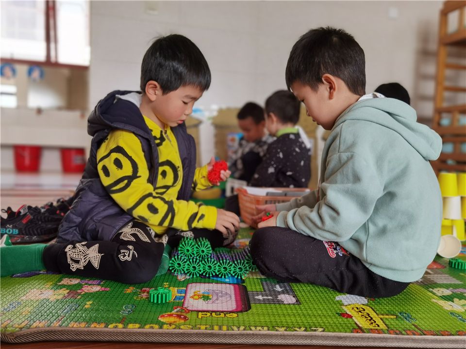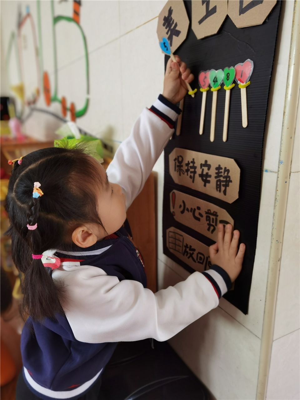 在区域活动中,小朋友们小声讨论着、当遇到疑问、碰到困难时,他们学会尊重他人、学会倾听、不干扰别人、玩具玩好把它放回柜子里……这些活动场景在背景音乐声中显得那么和谐温馨。他们在活动中学会了建立和遵守规则的自主性行为,他们通过集体和同伴之间的相互学习和约束,慢慢养成了一定的行为规范。