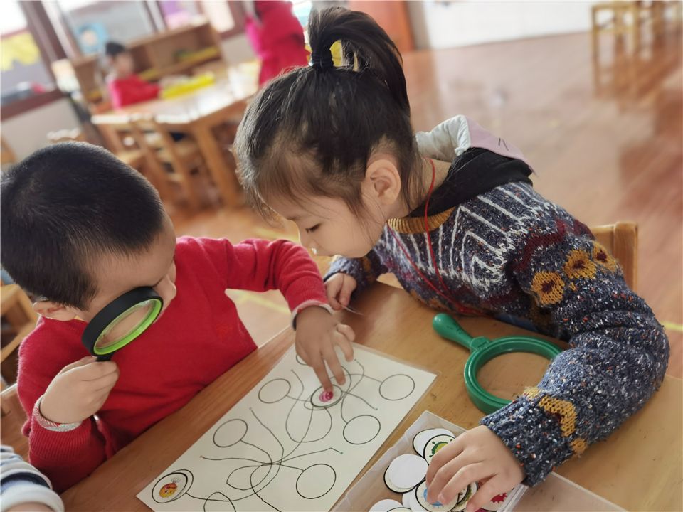 王茜和芷榕两个人正在玩抓新冠病毒的游戏,只见两个小朋友一人拿着一个放大镜,认真地找着躲藏在迷宫里的病毒,王茜小朋友不时提醒着小伙伴“往这走,不要走错路啦。”哈哈哈,一会儿工夫,所有的新冠病毒都被这两个能干的小卫士抓完啦。