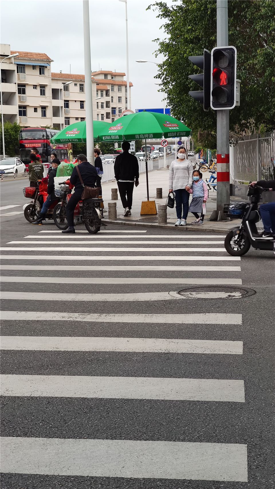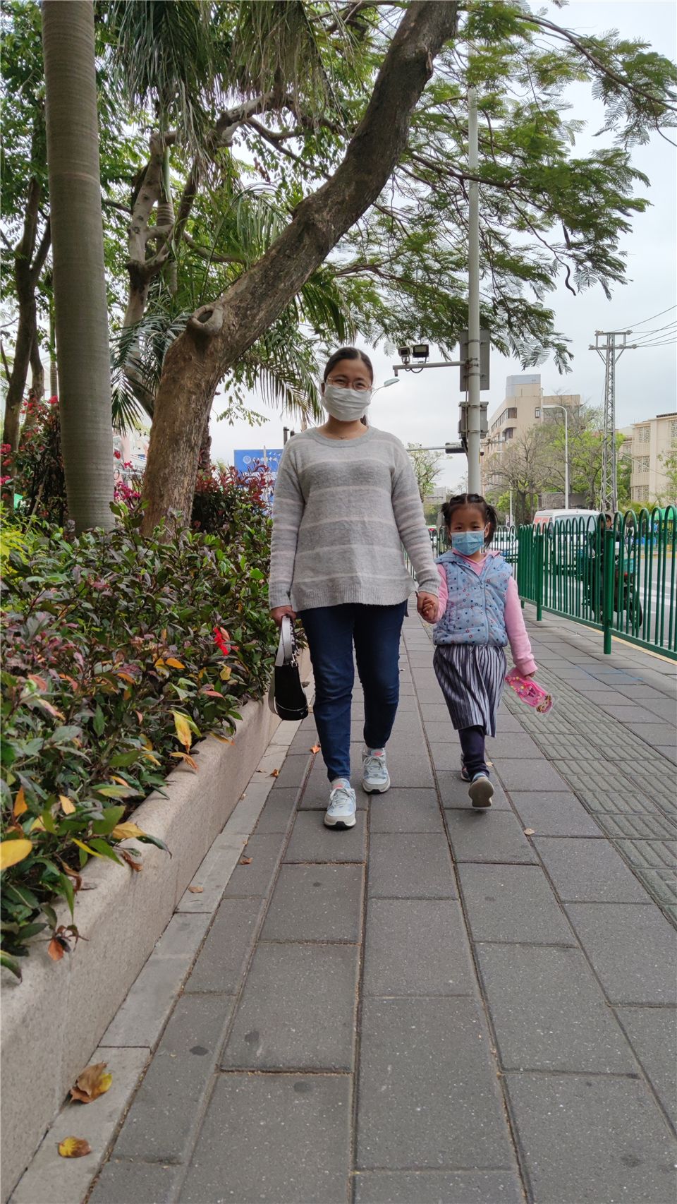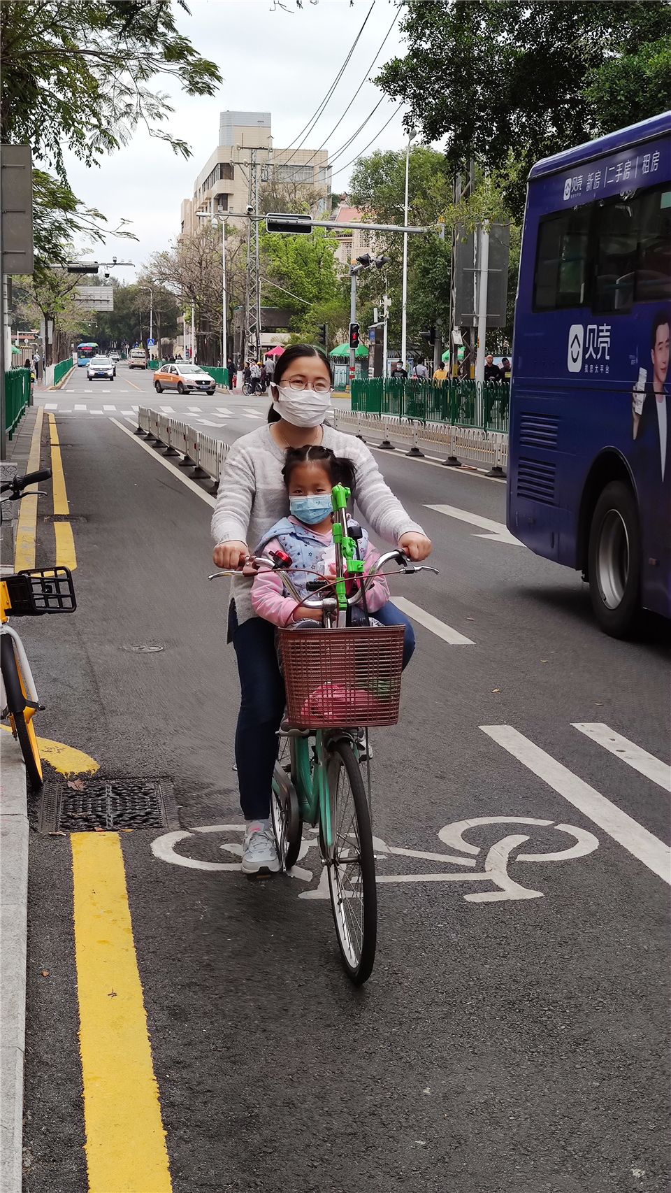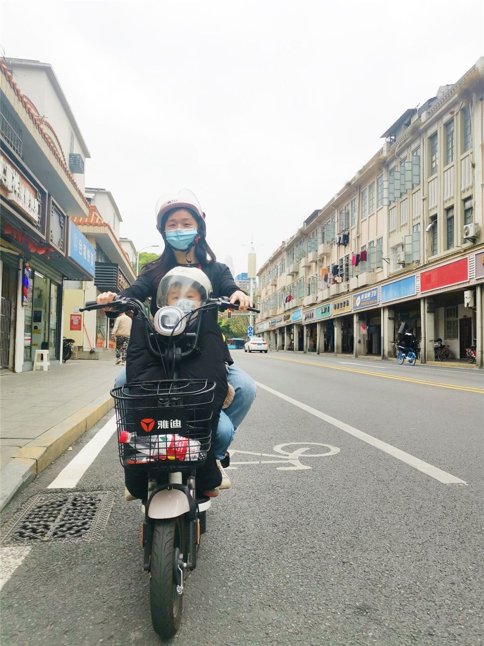 妈妈和我都戴上了安全头盔,帅气又安全。电动车也要骑在自行车专用道,不占道行驶哦。