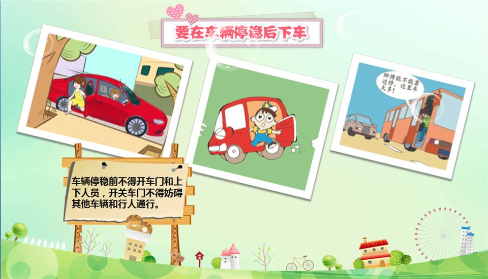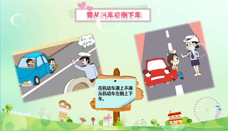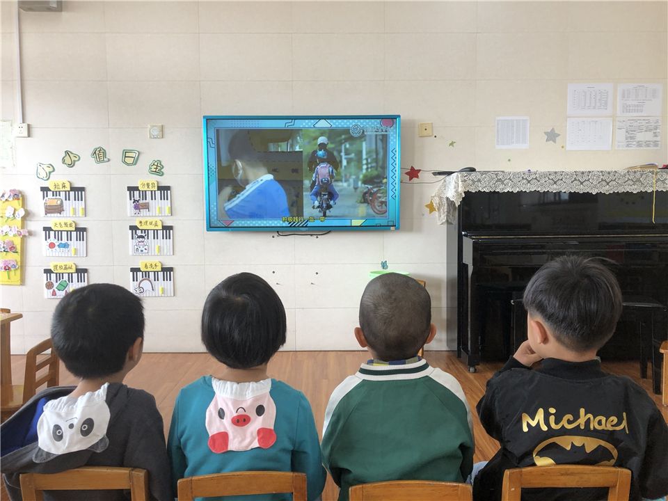 老师也利用生动形象的PPT和动画片,向孩子们介绍交通安全基本知识。直观形象的方法和生动有趣的内容一下子吸引了大家。孩子们在轻松愉快的气氛中掌握了交通安全的基本知识。