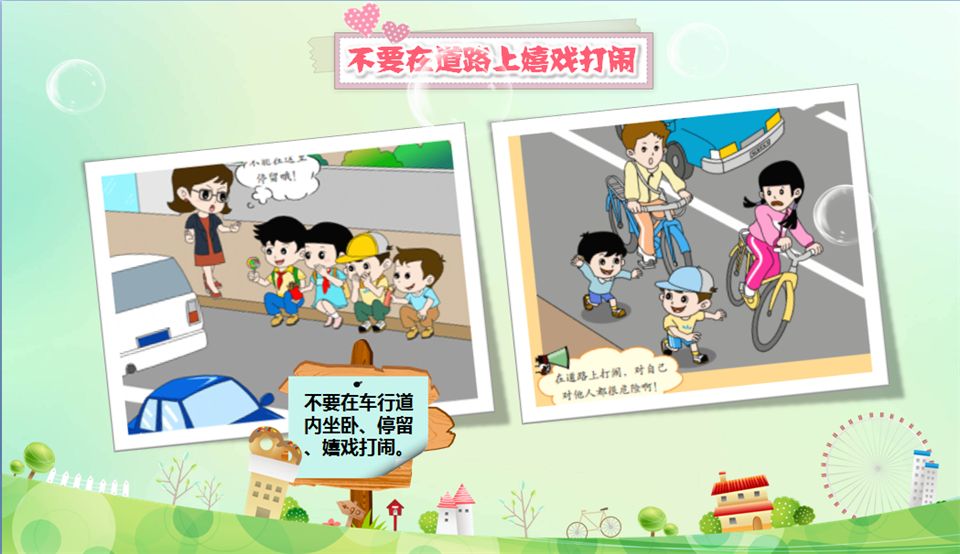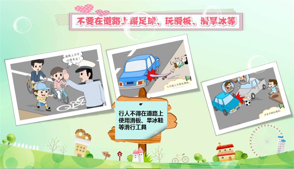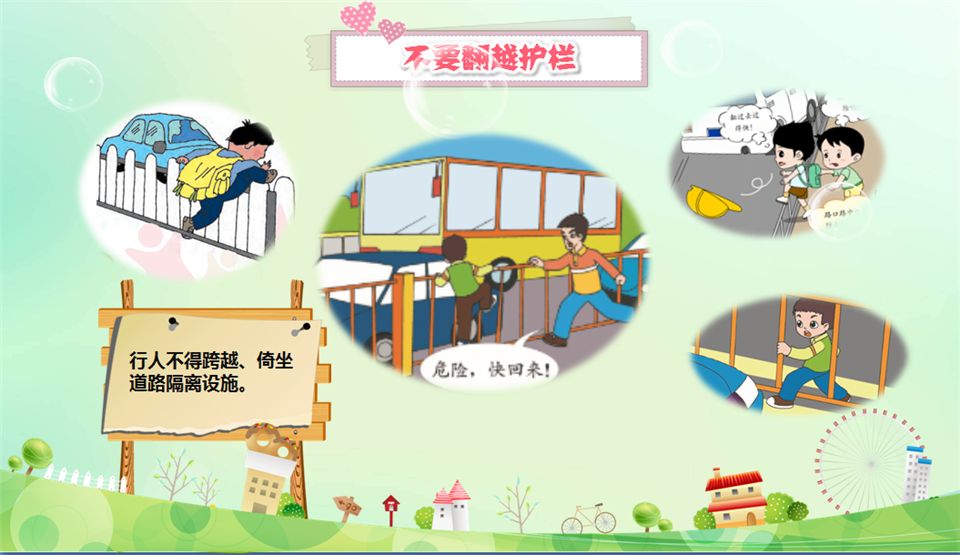 不要翻越护栏,不在马路上踢球、滑旱冰、玩滑板。