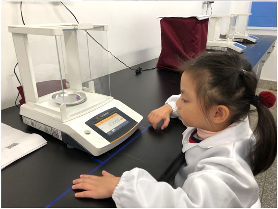 瞧!萌娃们在一旁静静的观察着大学生哥哥姐姐们做实验。一双双好奇的眼睛散发了观察探索的光芒,他们鸦雀无声地观察思考着。大学生姐姐还带我们参观了“电子测量分析天平”。并告诉小朋友们这是电子测量分析天平,可以测量一些小东西。萌娃们也迫不及待想动手称称自己的小发夹有多重了。