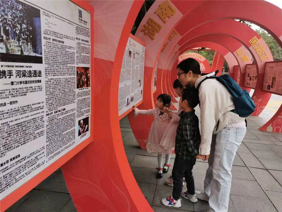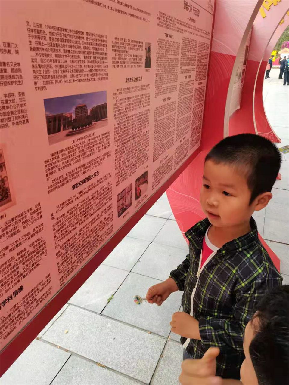 嘉庚楼前有一条红色长廊——“厦门大学与我的祖国”,这里汇聚了祖国各省市的报纸,细说着厦大与祖国各地剪不断的深情厚谊。看,小朋友们正和爸爸妈妈在长廊里仔细的找寻并阅读自己家乡的故事,一起了解厦大为建设祖国做出的贡献。而校史馆里更是热闹非凡,小朋友们一边听着大学生志愿者的讲解,一边与志愿者姐姐互动着,他们了解了厦大的历史,知道了陈嘉庚爷爷创办了厦门大学……