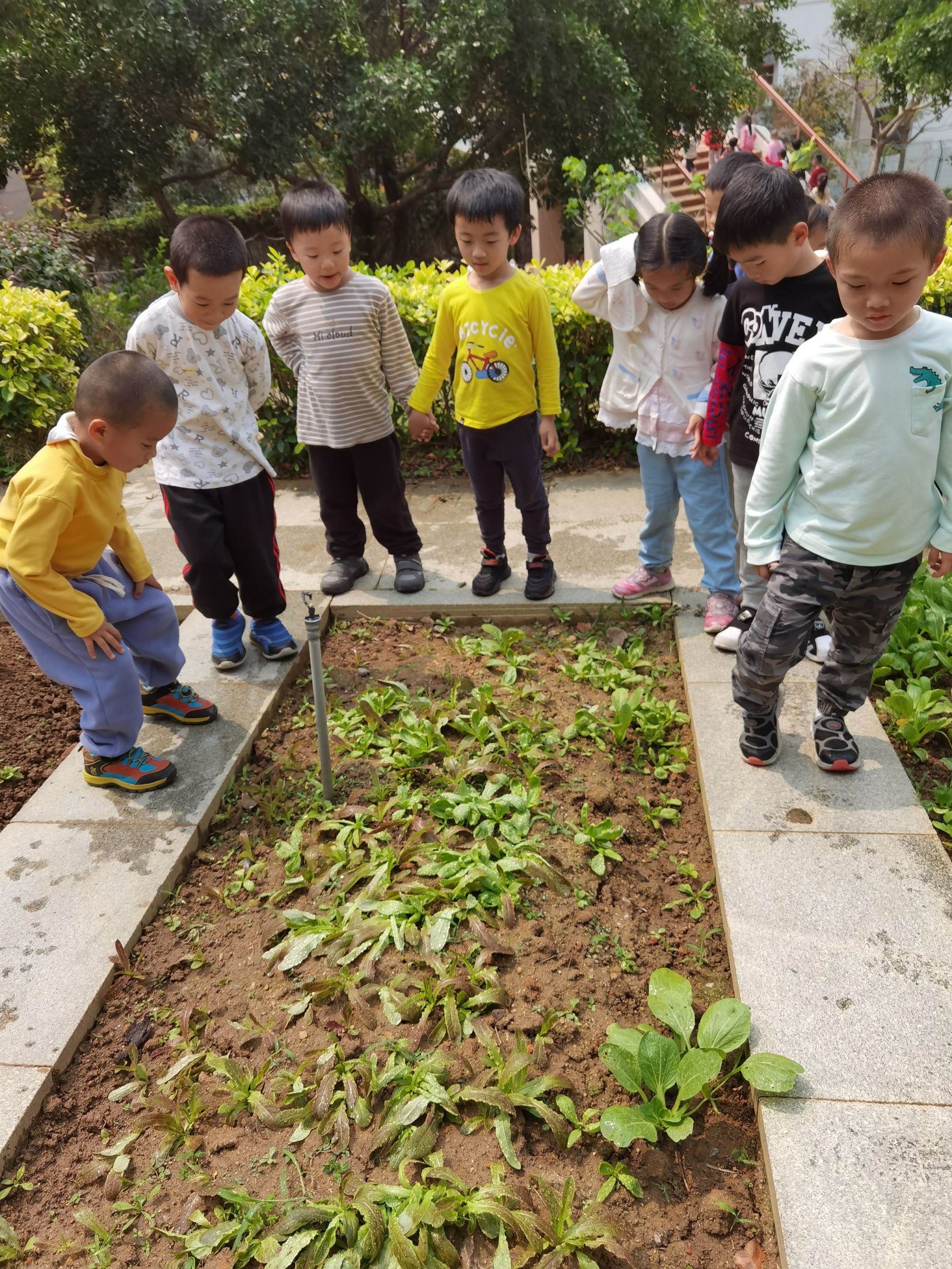 小山坡中六班的菜地热闹非凡,小朋友们正围着班级菜地和小伙伴们交流起来。