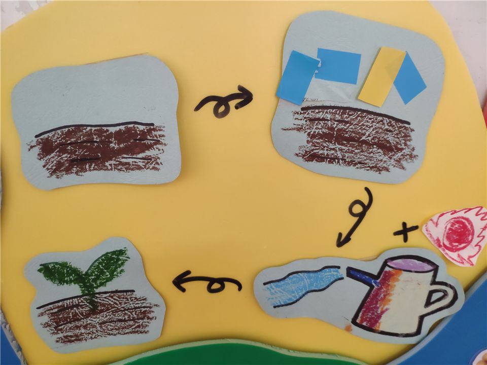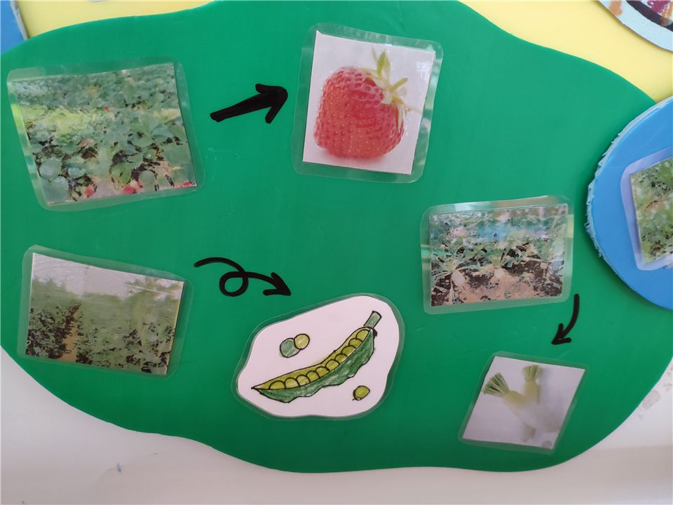 “我们餐桌上的饭菜从哪里来呢?”“我知道!从菜地里种出来的。”“我想种我喜欢吃的包菜!”“可是,包菜要怎么种呢?”“对啊,我爱吃薯条,薯条也跟馒头一样是面粉做出来的吗?”福娃们带着疑问,跟爸爸妈妈一起查找自己喜欢的食物的来源过程,制作成了“食物来源过程图”。
