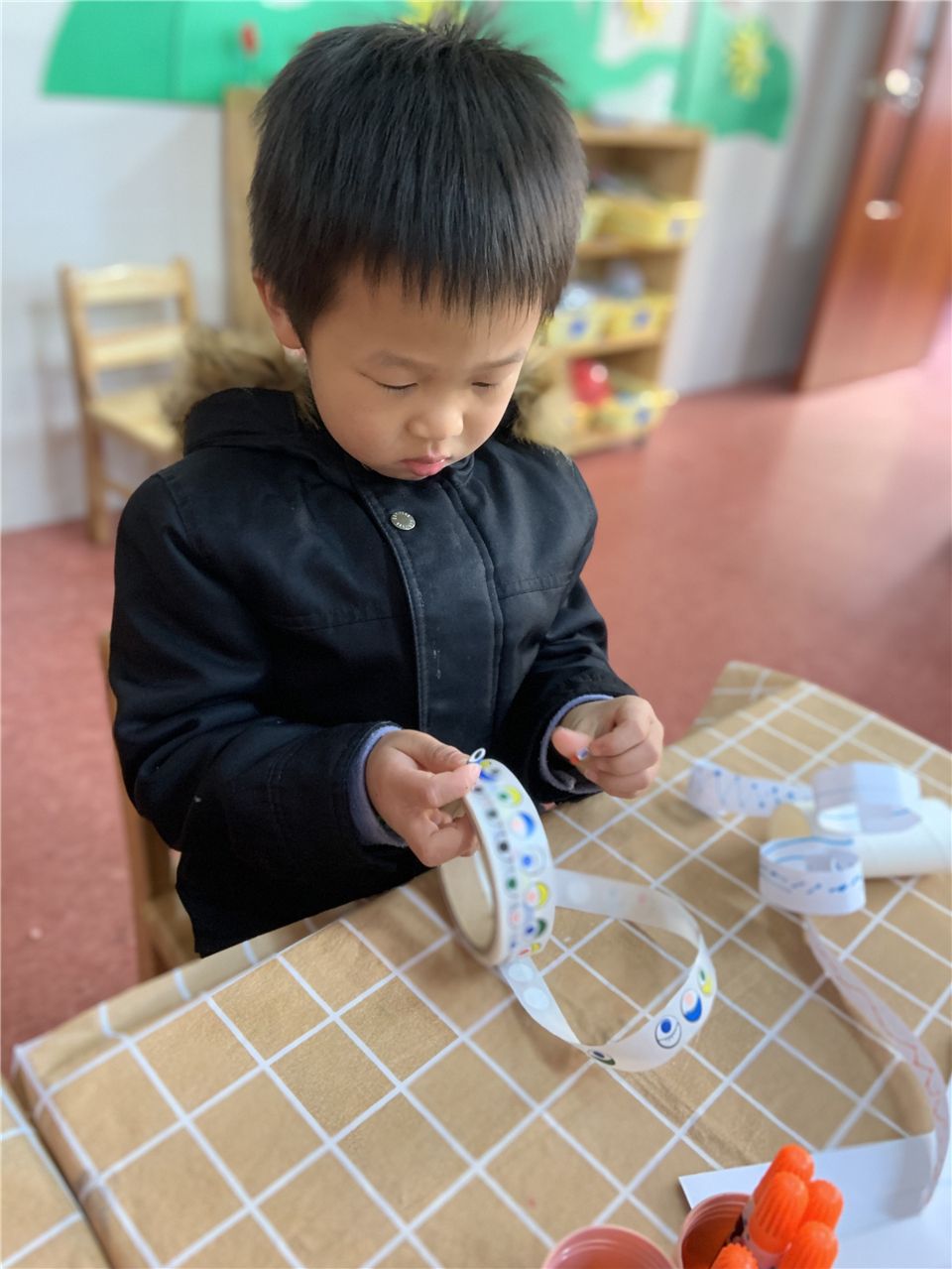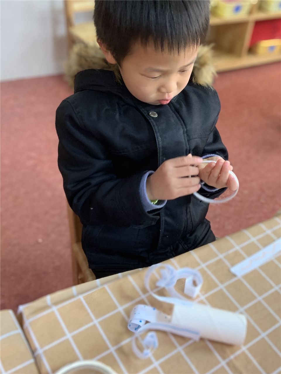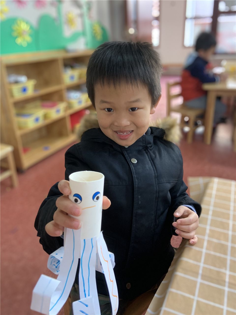 “看,我用卷芯筒做了一只小章鱼。”小海利用了卷芯筒当章鱼的身体,接着用纸条贴满卷芯筒的下端作为章鱼的触手,最后贴上眼睛,小章鱼就完成啦。