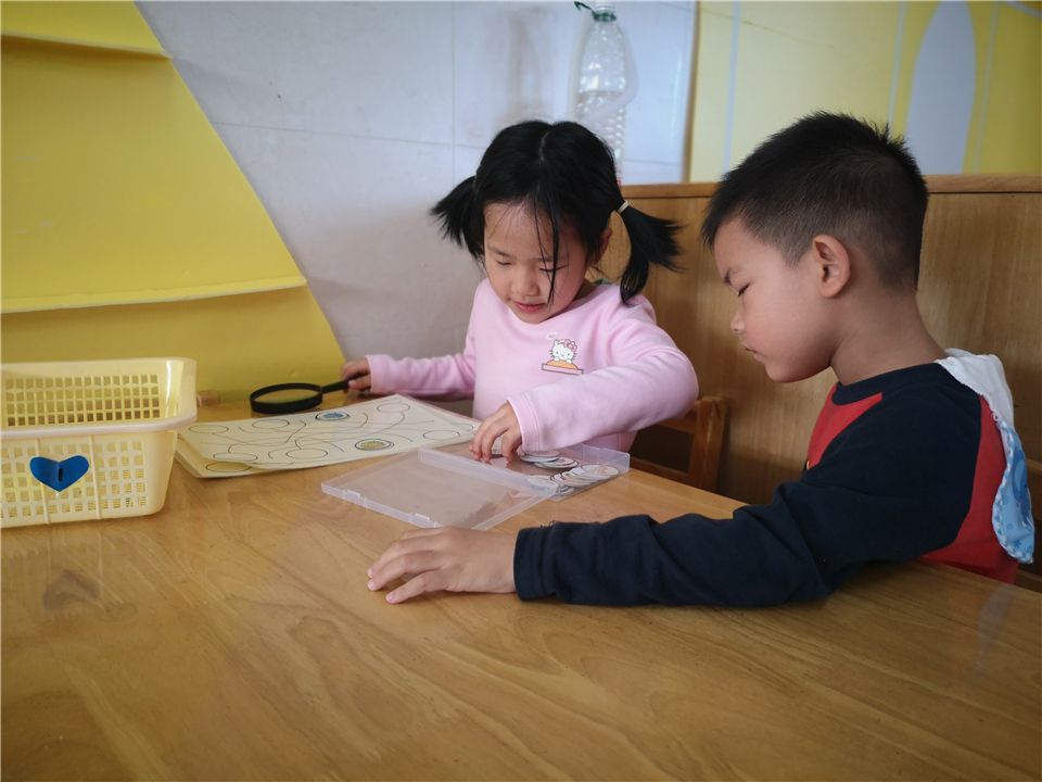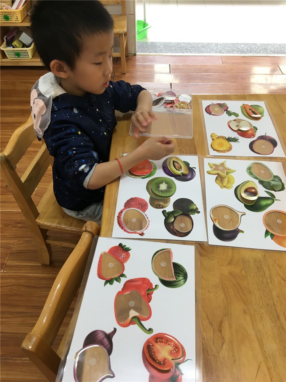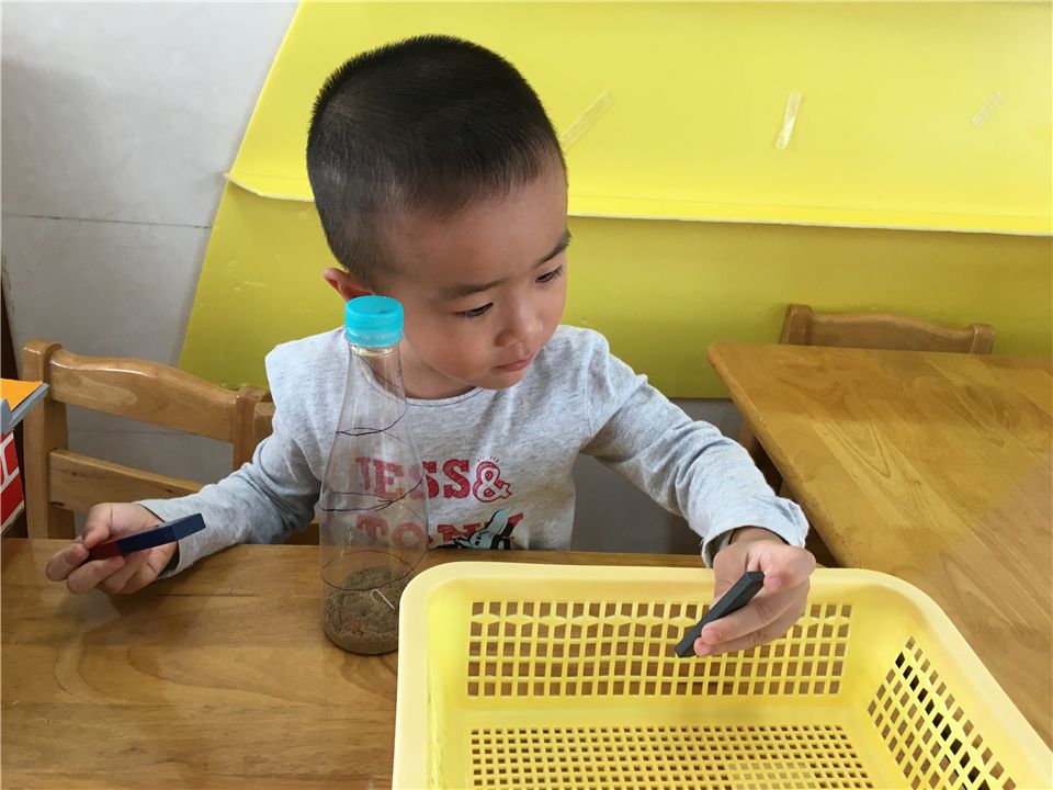 探索区里,投放着各种各样的材料,昆虫观察玩具、月亮天平、磁铁玩具等等。未来的科学家们正遨游在科学的海洋中,他们有的在做实验,有的在观察着树叶、昆虫的秘密,有的在探索不同水果的内部结构……