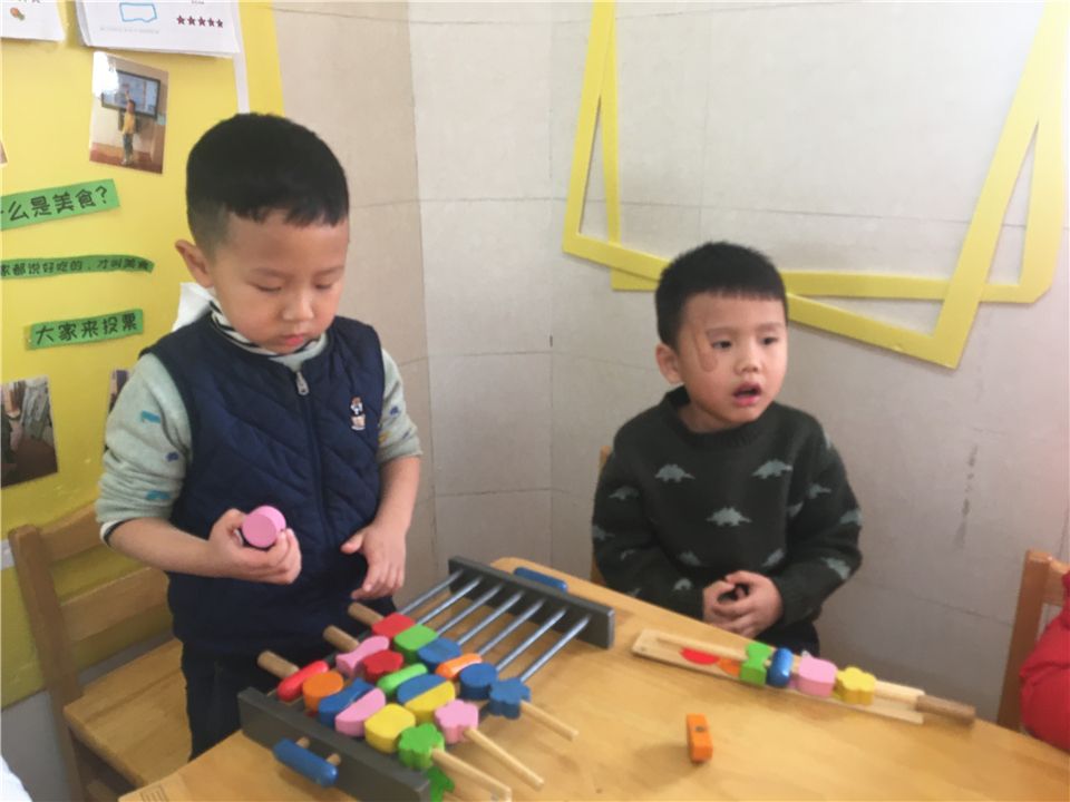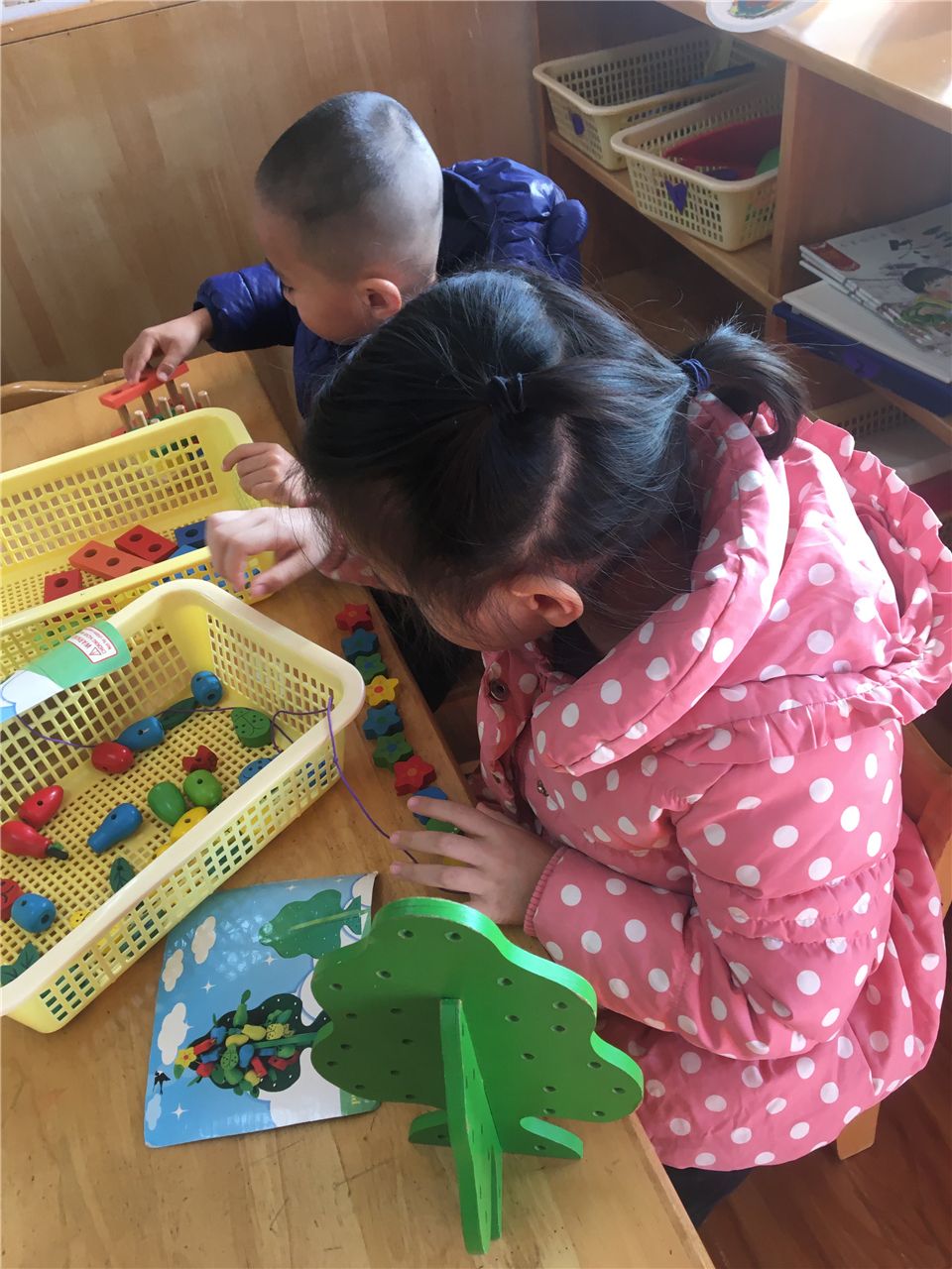 小齐选择了穿线板,她把花和水果分开来放,正在按照规律给花朵宝宝排好队,再用线穿起来。