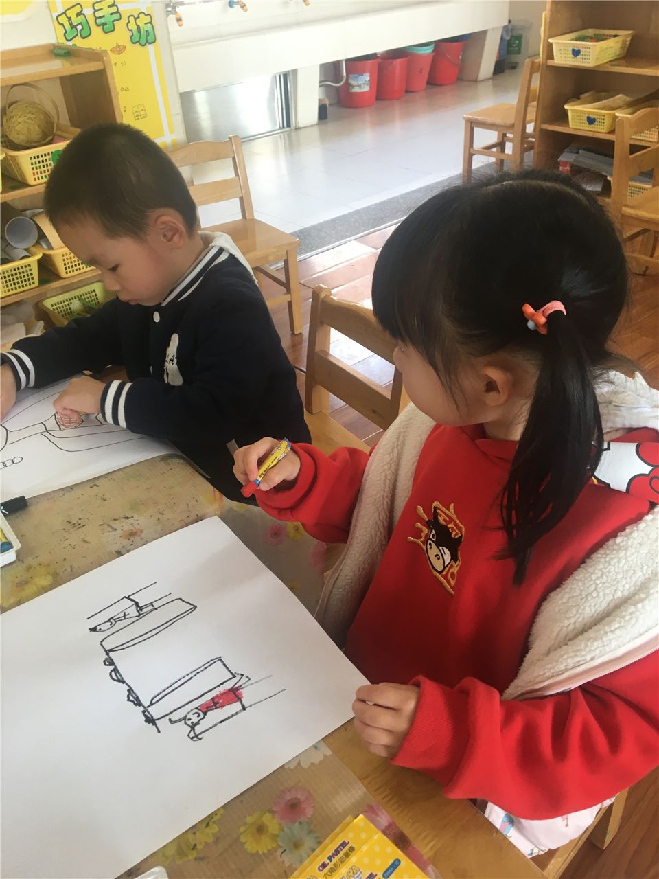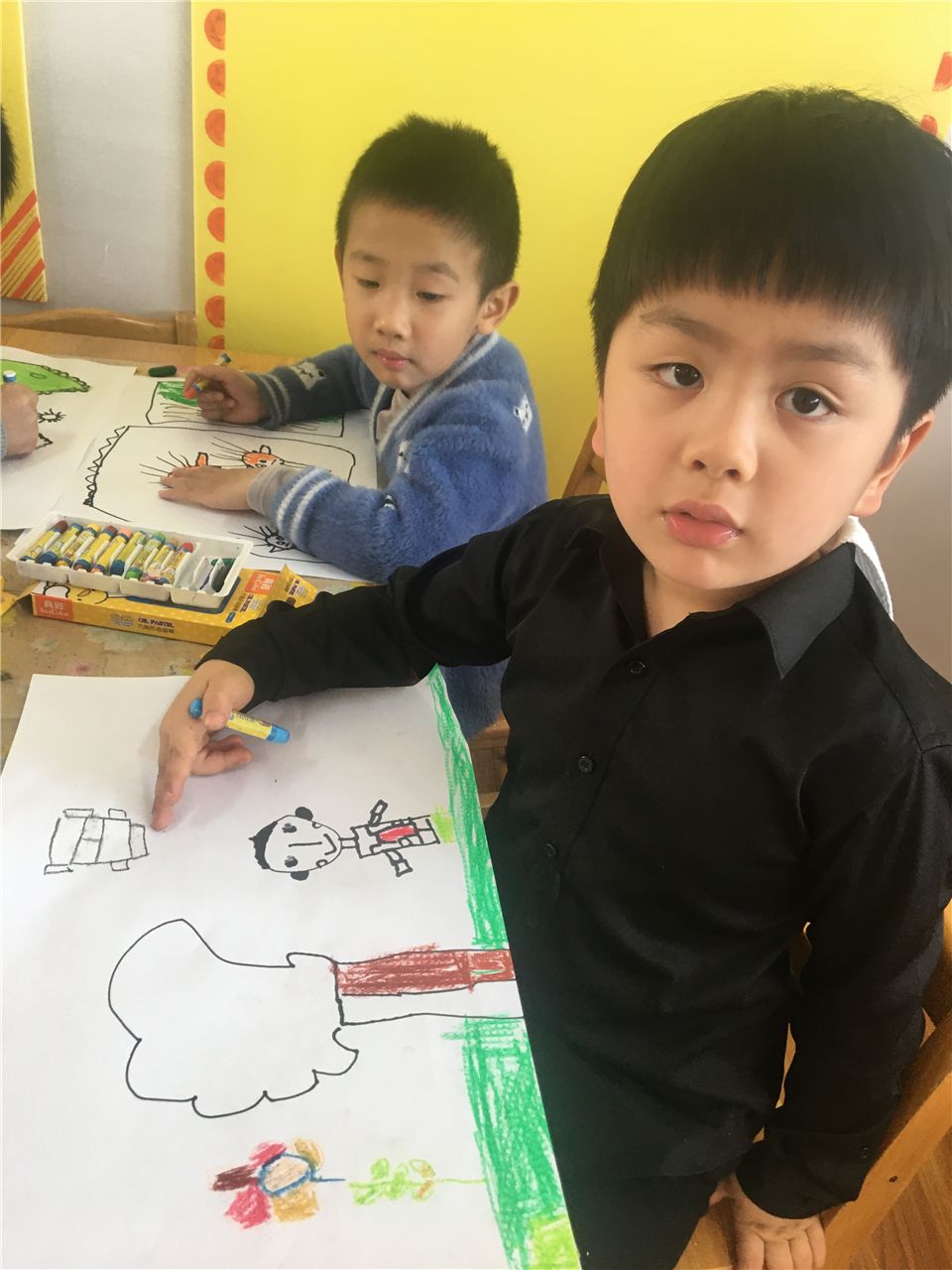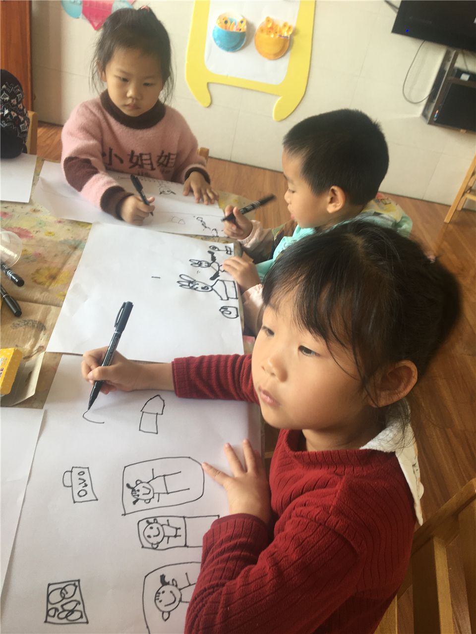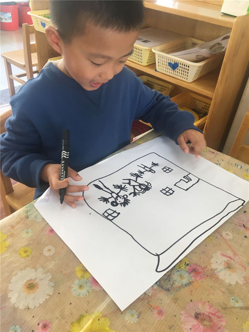 孩子们认真地一笔一画地画着。一会儿工夫,很有故事画面感的作品就新鲜出炉了。我们一起来欣赏一下吧!