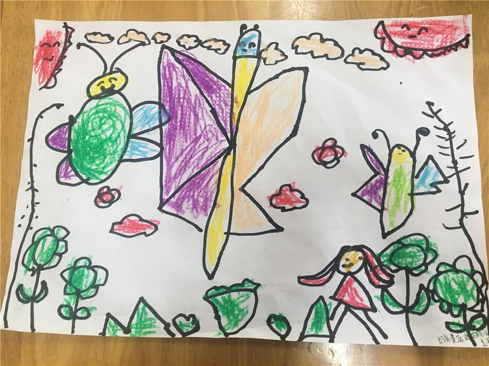 韩韩:“你们看,我画的是我去外婆家的动物园玩,有很多的蝴蝶可漂亮了!”