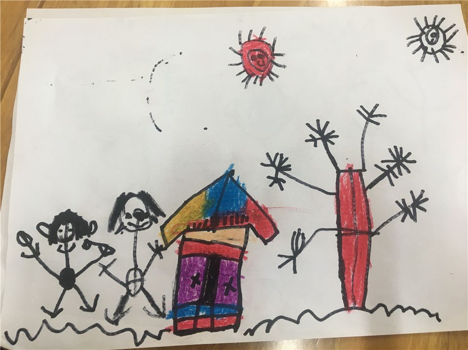 汐汐:“蔡老师,我画的是我和爸爸妈妈在家玩乐高,这是我假期里最开心的事了,上面画这个是我家的阳台。”