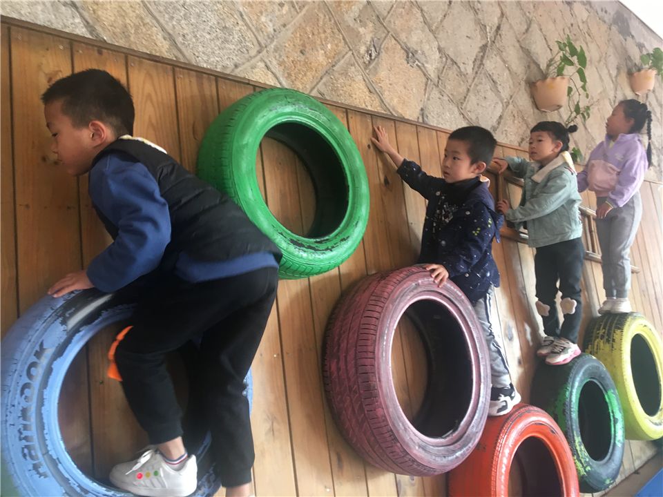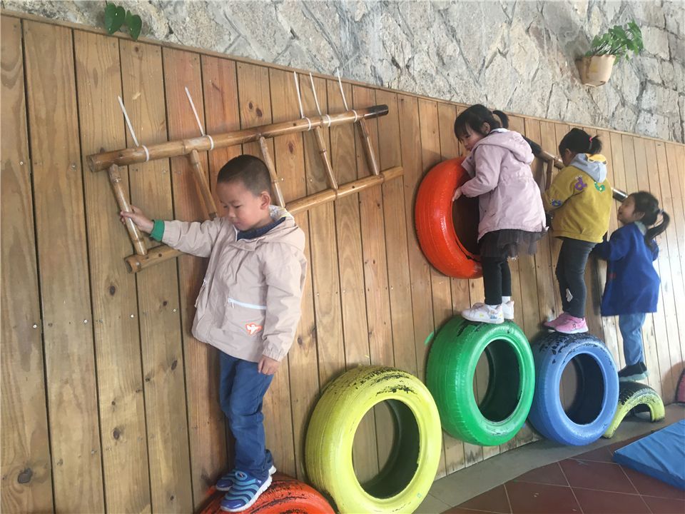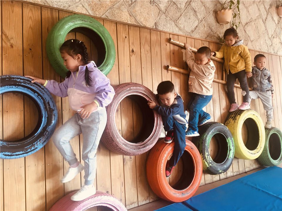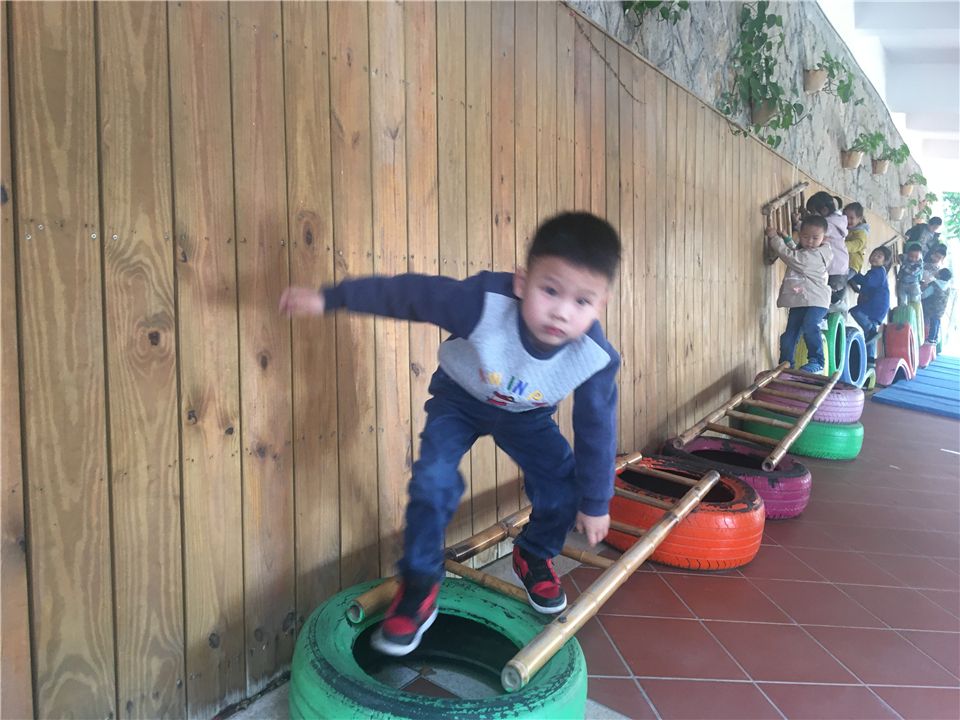 孩子们伴随着欢快活泼、富有韵律感的音乐陆陆续续来到户外场地啦!在东一楼的轮胎攀爬墙上,孩子们早已铺好蓝色的地垫了正在排着队伍有序地一个接一个爬上轮胎墙。当前面的孩子遇到比较难爬的轮胎时,后面的孩子会主动提醒他:“你要向下爬,不然是爬不过去的。”一会儿功夫。孩子们就跨过一个小障碍走过竹梯桥。“我还有玩一次哦,太好玩了!”孩子们在攀爬区自由自地练习攀爬的动作。