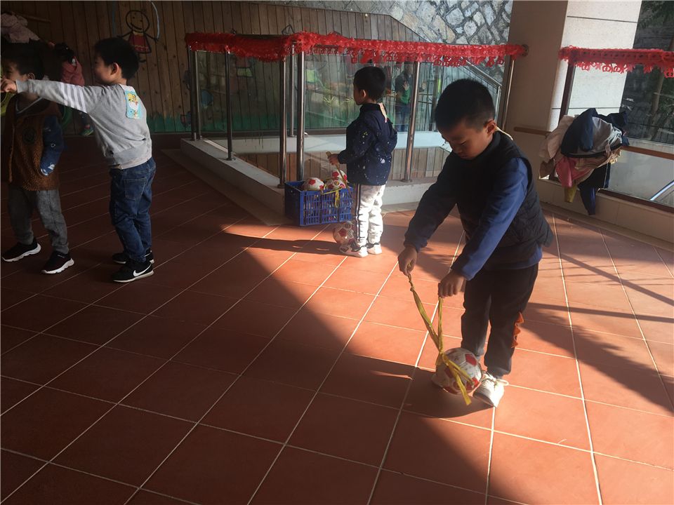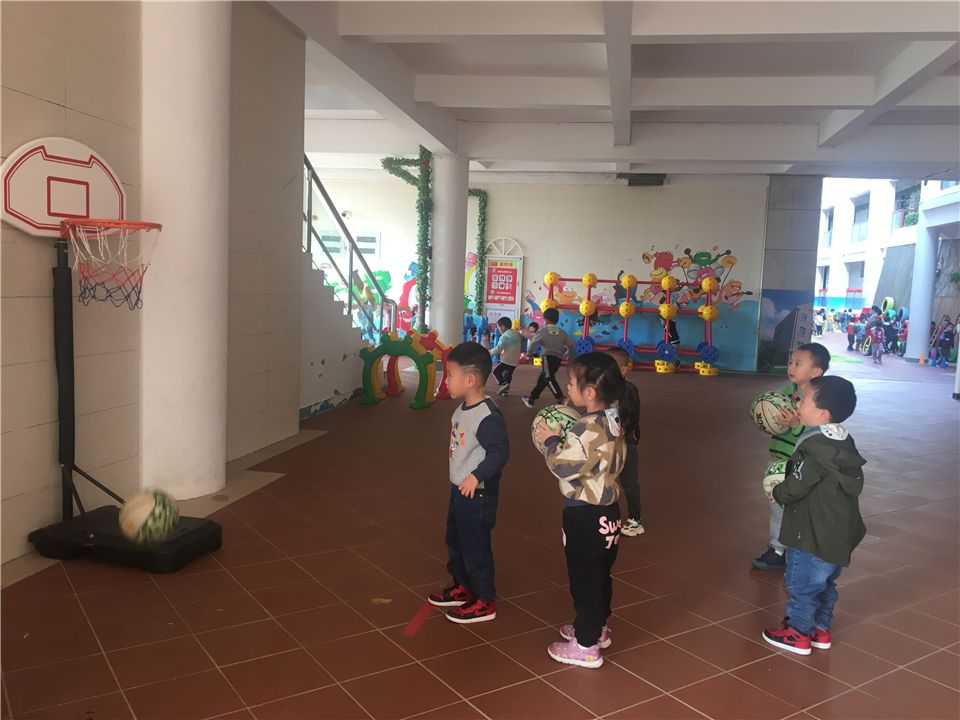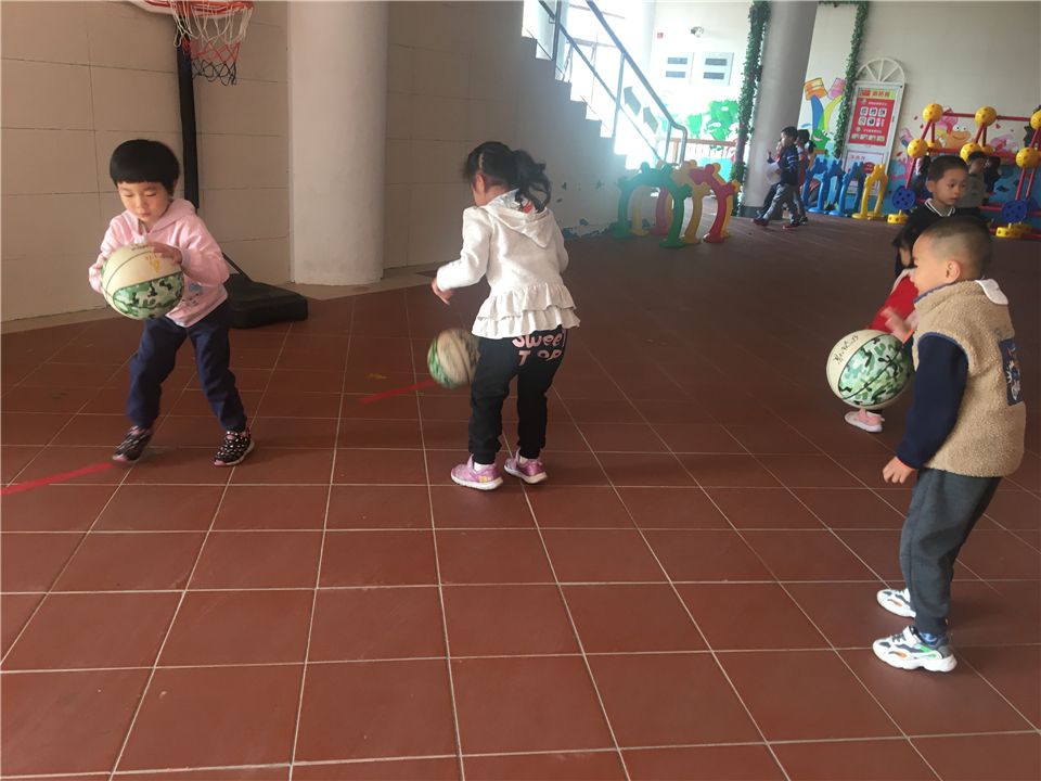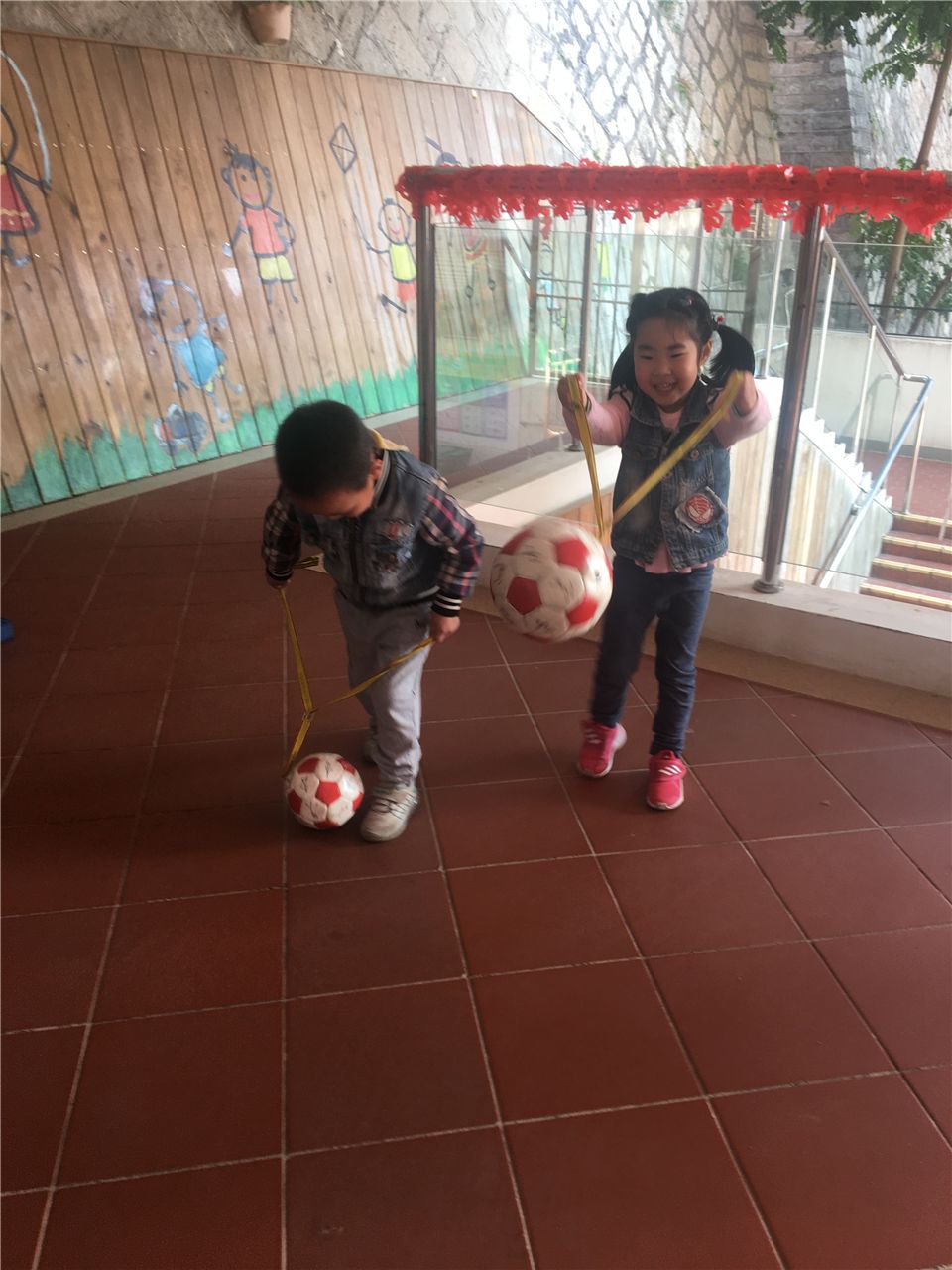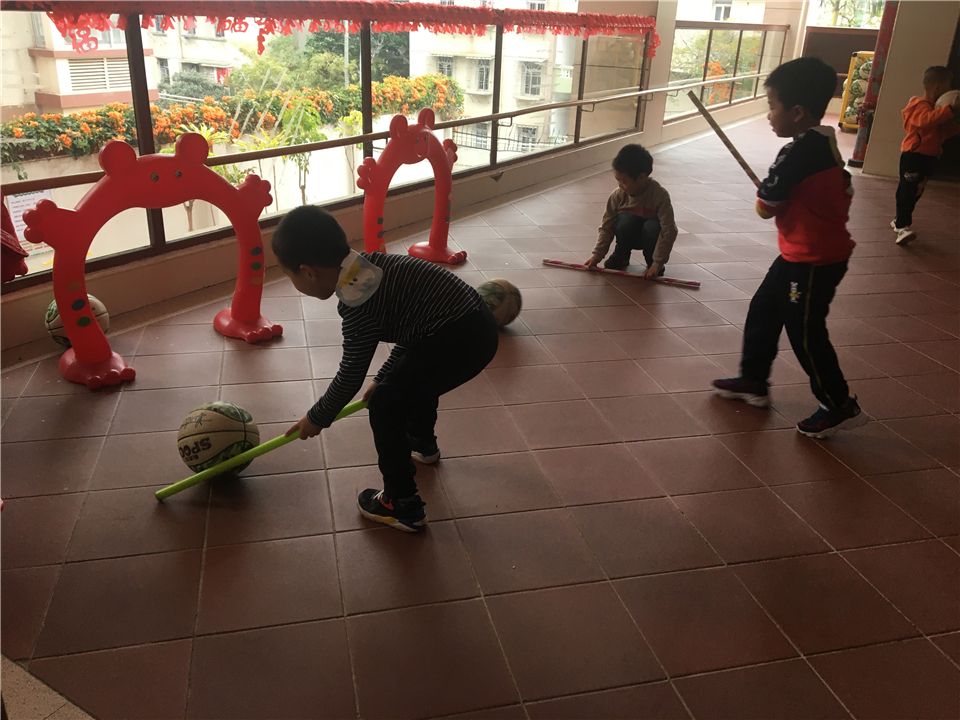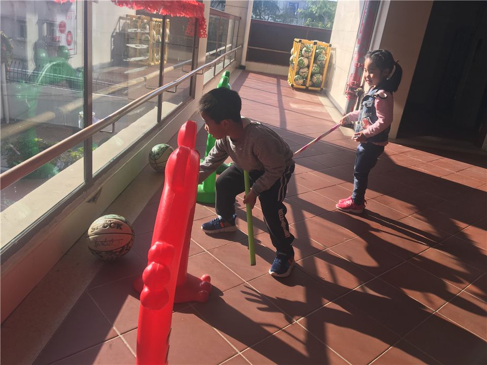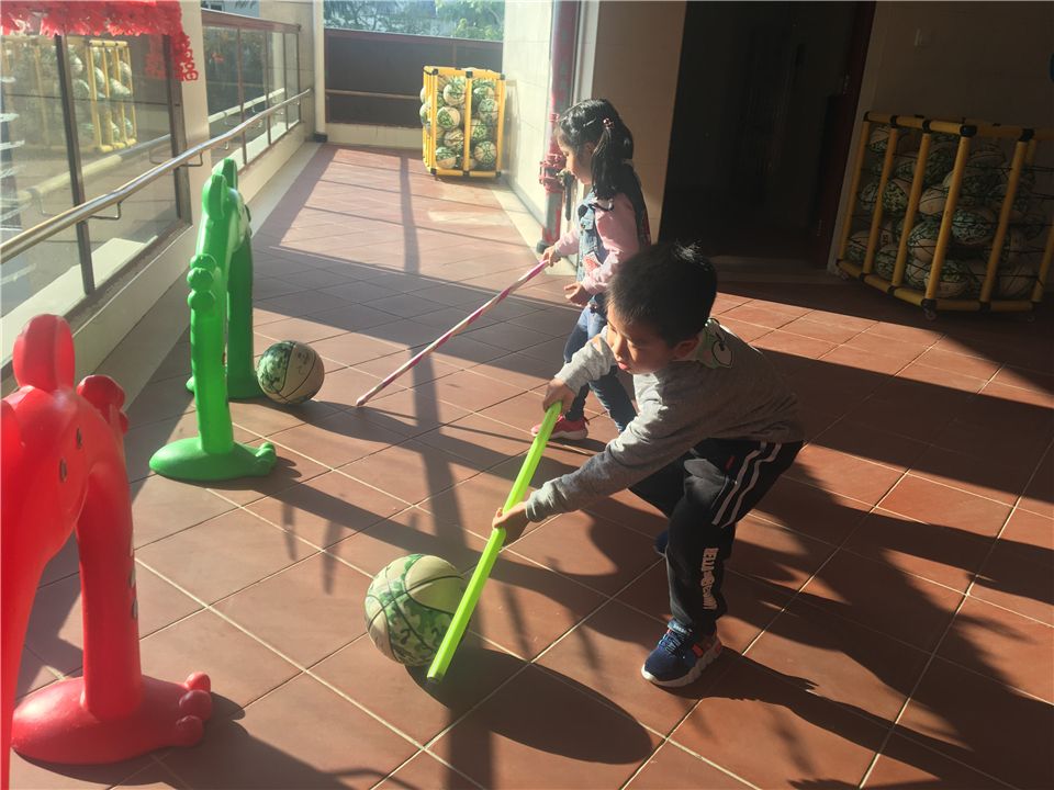 在对面的场地上,孩子们化身为篮球运动员三两成群在排着队伍,一个接一个在练习投篮。玻璃栏杆前,几个孩子拿着塑料水管棒在玩 “赶小猪”的游戏 ,翔翔三两下就把球赶入洞,厉害极了。另一边的孩子们化身为足球小将双手抓住绳子,小脚用力地向上提着足球。