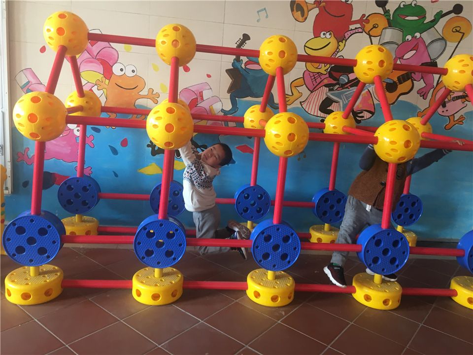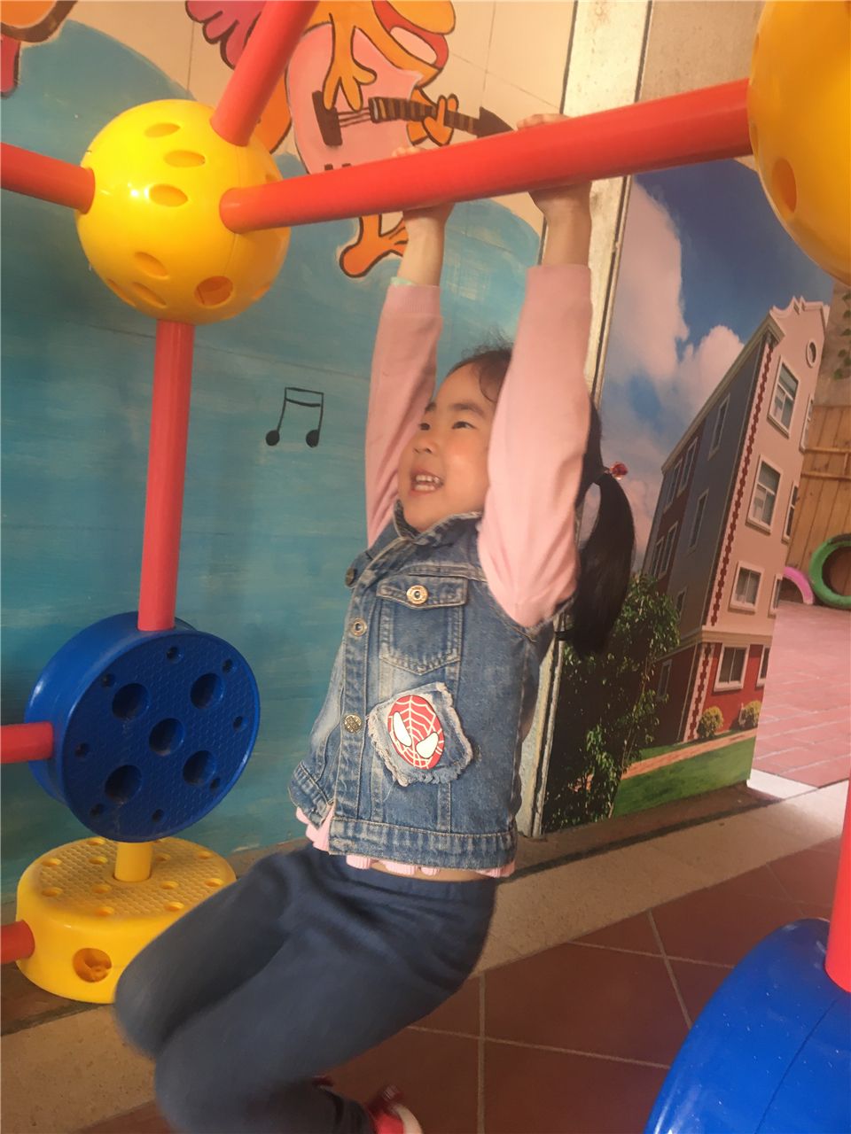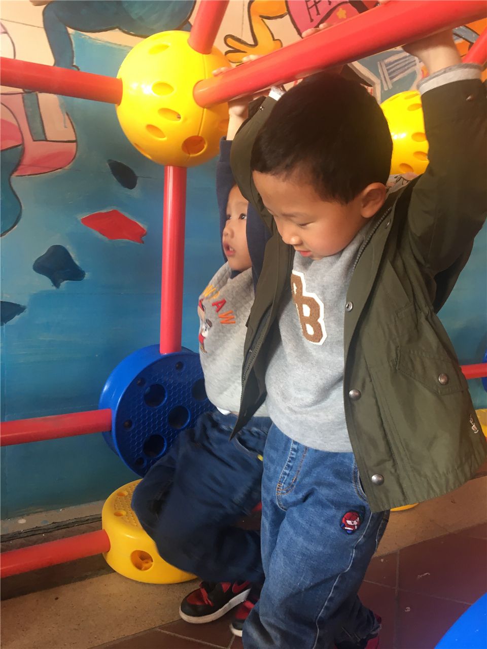 荡桥区也深受孩子们的喜欢,一会儿功夫就有很多“小迷妹”、“小迷弟”前来打卡啦!要玩荡桥区必须要经过一个拼接的 “小房子”,聪明的孩子们双手向上抓住“小房子”的横杆,双脚向上弯曲,玩起“荡秋千”的游戏,灿烂的笑容在小脸上绽放着。