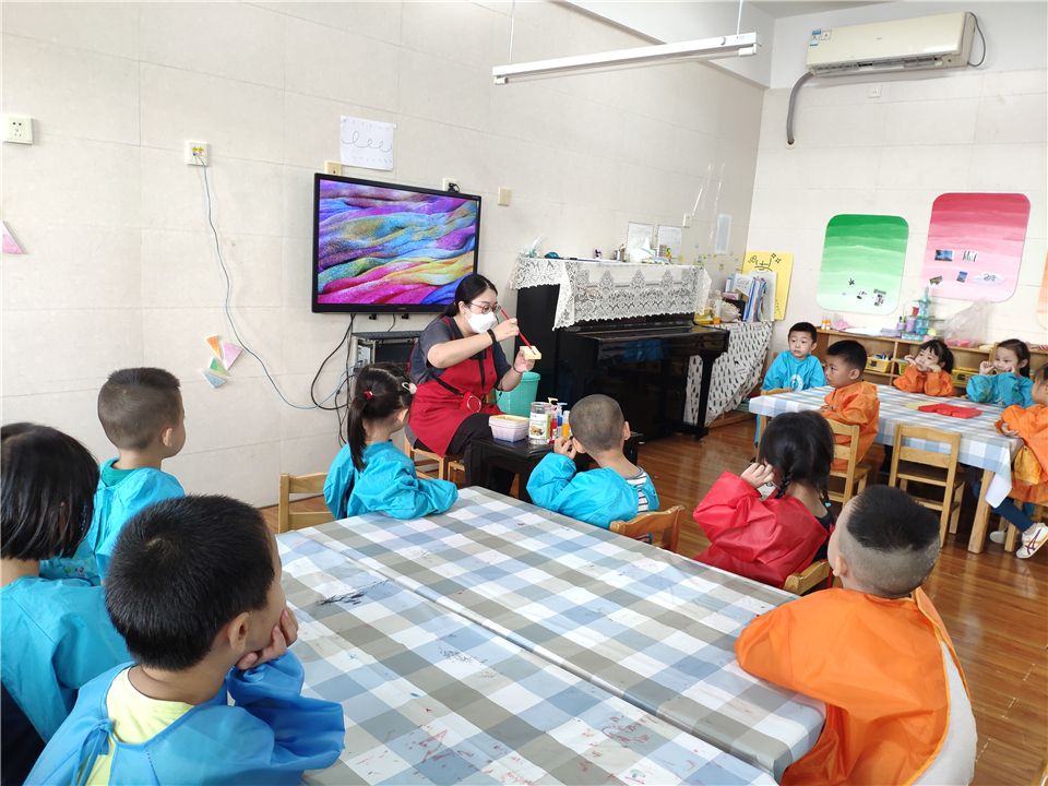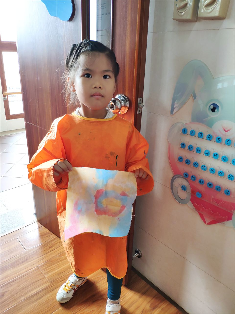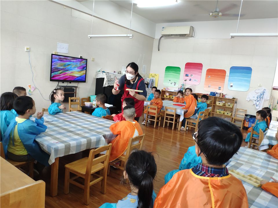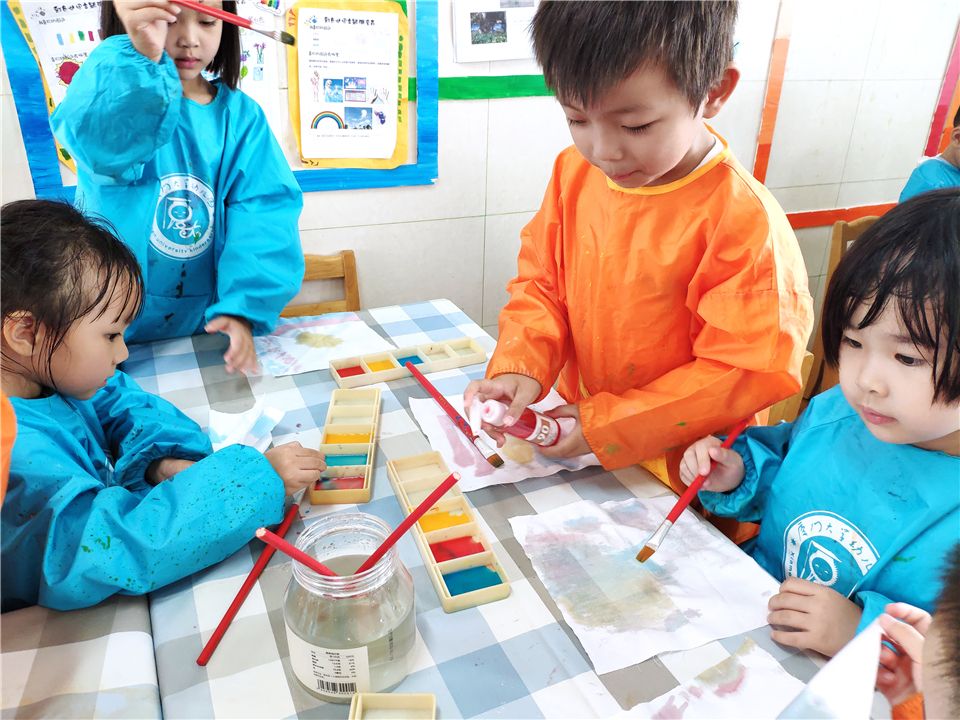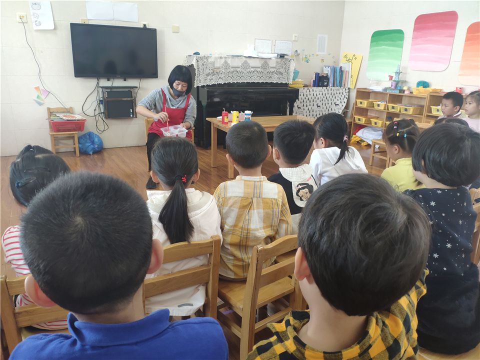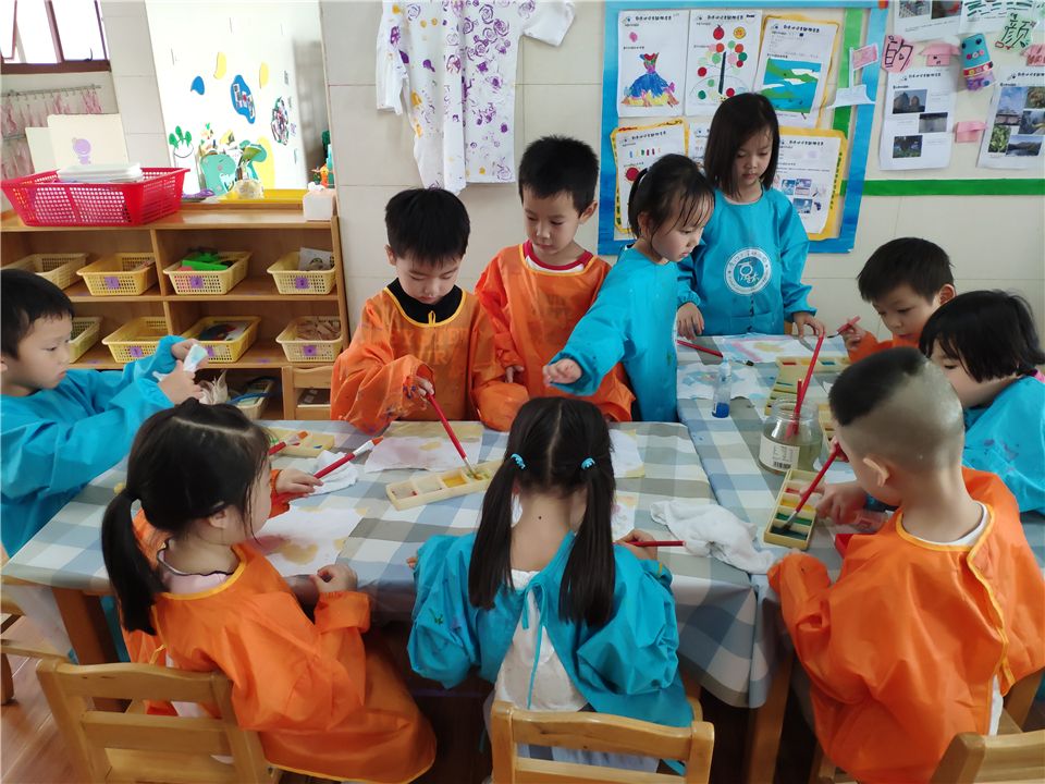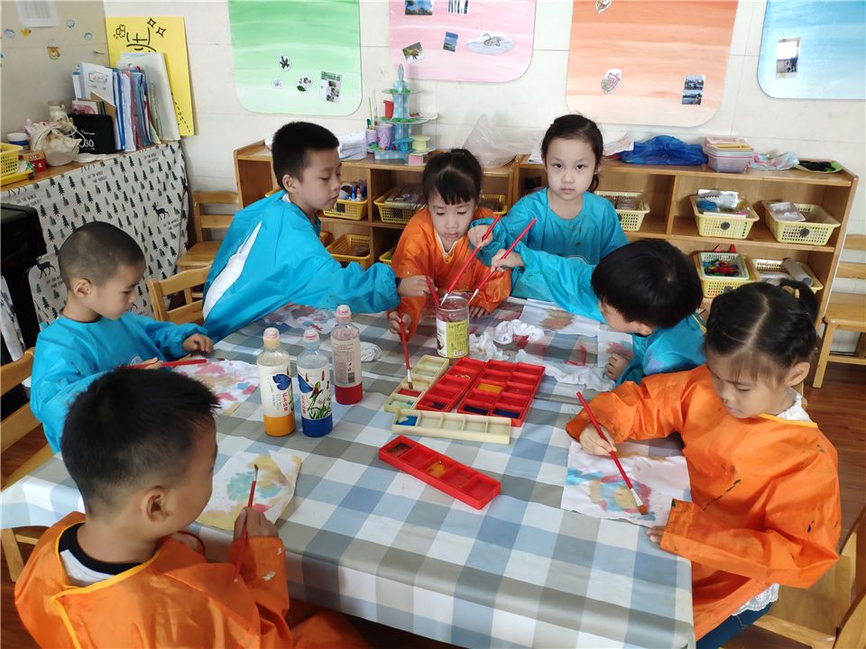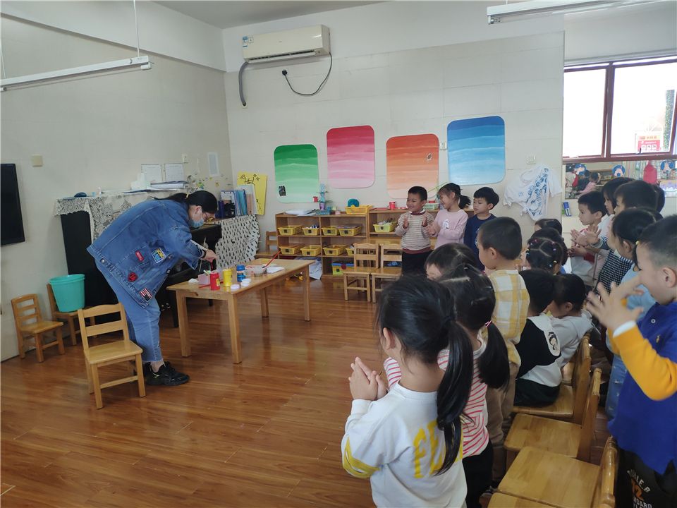 于是,老师们将“三原色”——红色、蓝色和黄色请进了中四班。红黄蓝三兄弟怎么样才能变出橙色的橘子、紫色的葡萄、绿色的青蛙呢?“魔术师”挥舞着排笔,将红黄蓝三兄弟两两组队,瞧!橙色、紫色、绿色就变出来啦!福娃们纷纷拍手叫好!这可太神奇啦。