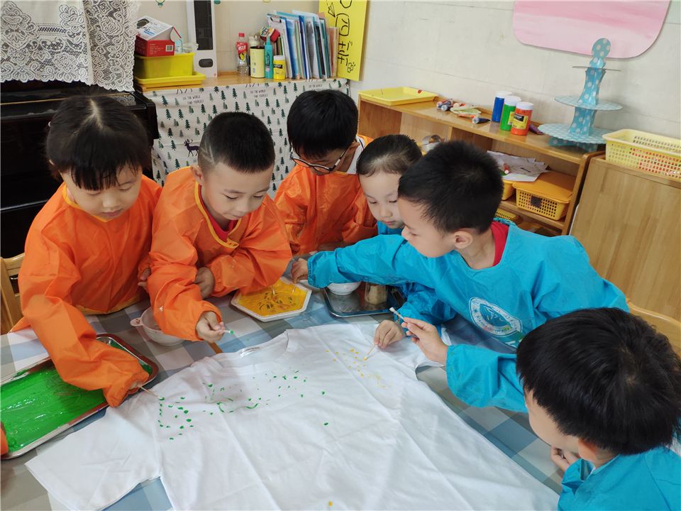 小小染布师傅们在“中四染布坊”与红黄蓝三兄弟亲密接触,使用颜料、排笔、喷雾等材料,印染出精彩纷呈的作品。同时,福娃们在印染过程中,感受到我们身上衣物的来之不易,纷纷表示以后将更加珍惜他人的劳动成果。