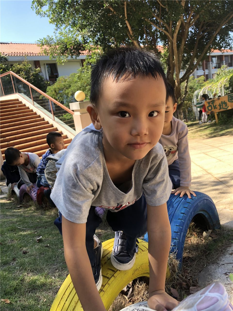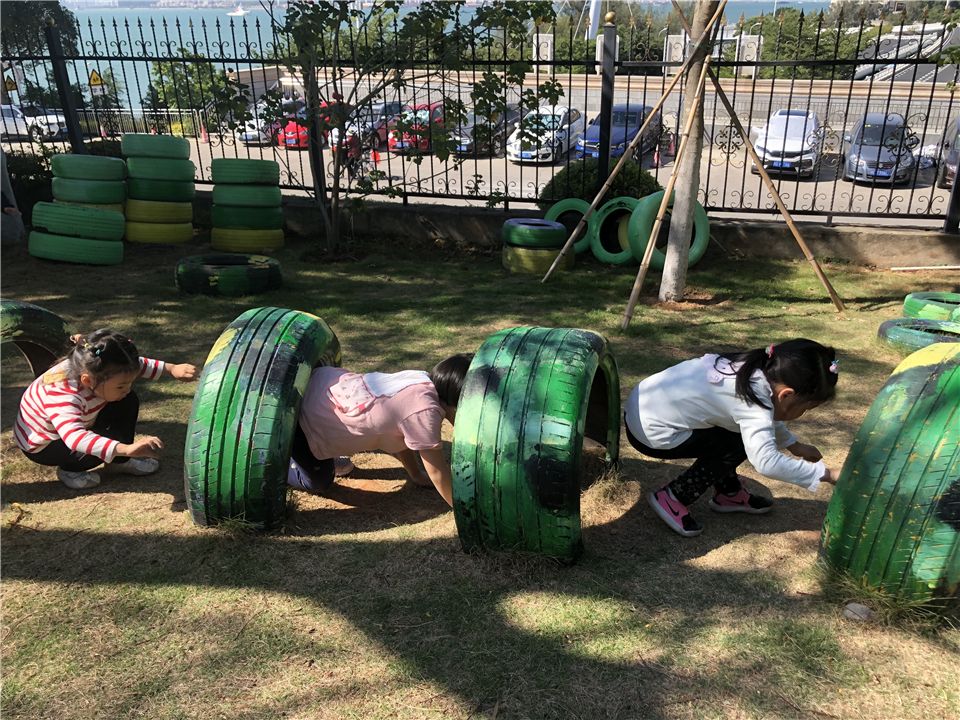 萌娃们在不同颜色的轮胎上手脚并用地向前爬。