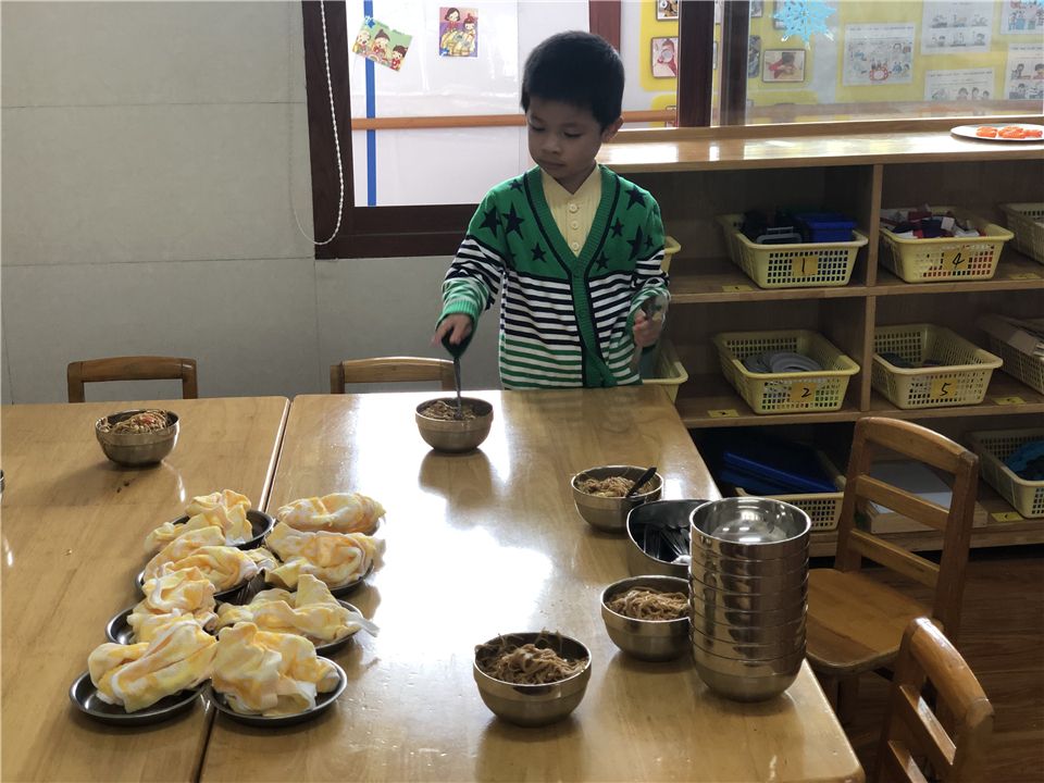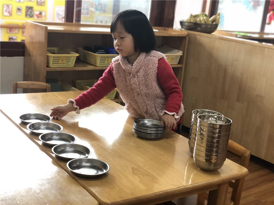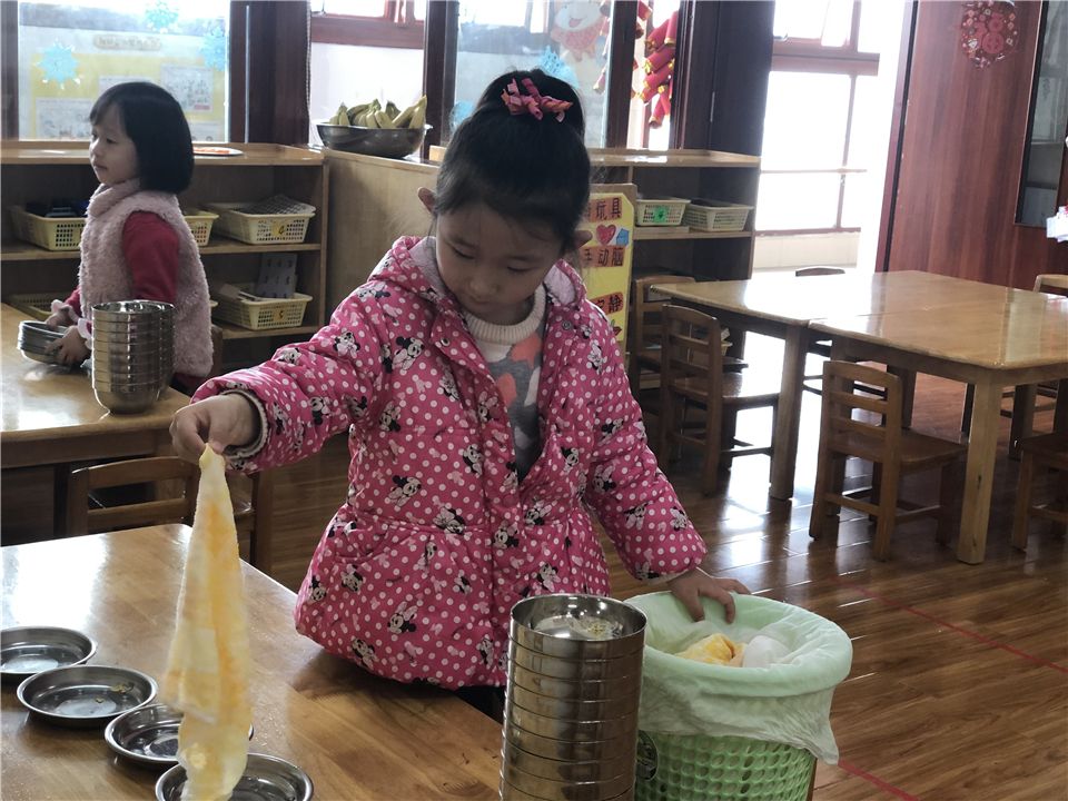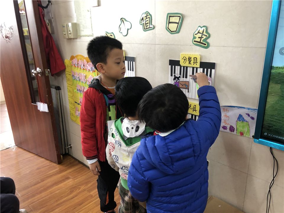 准备吃午餐了,小小值日生也开始忙了起来,“我们是陈老师的好帮手哦,我来分毛巾,我来分餐具。”