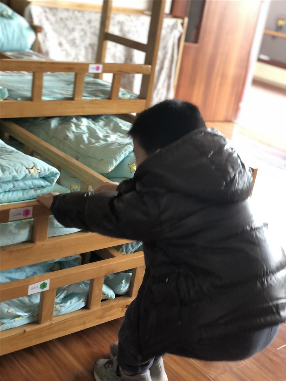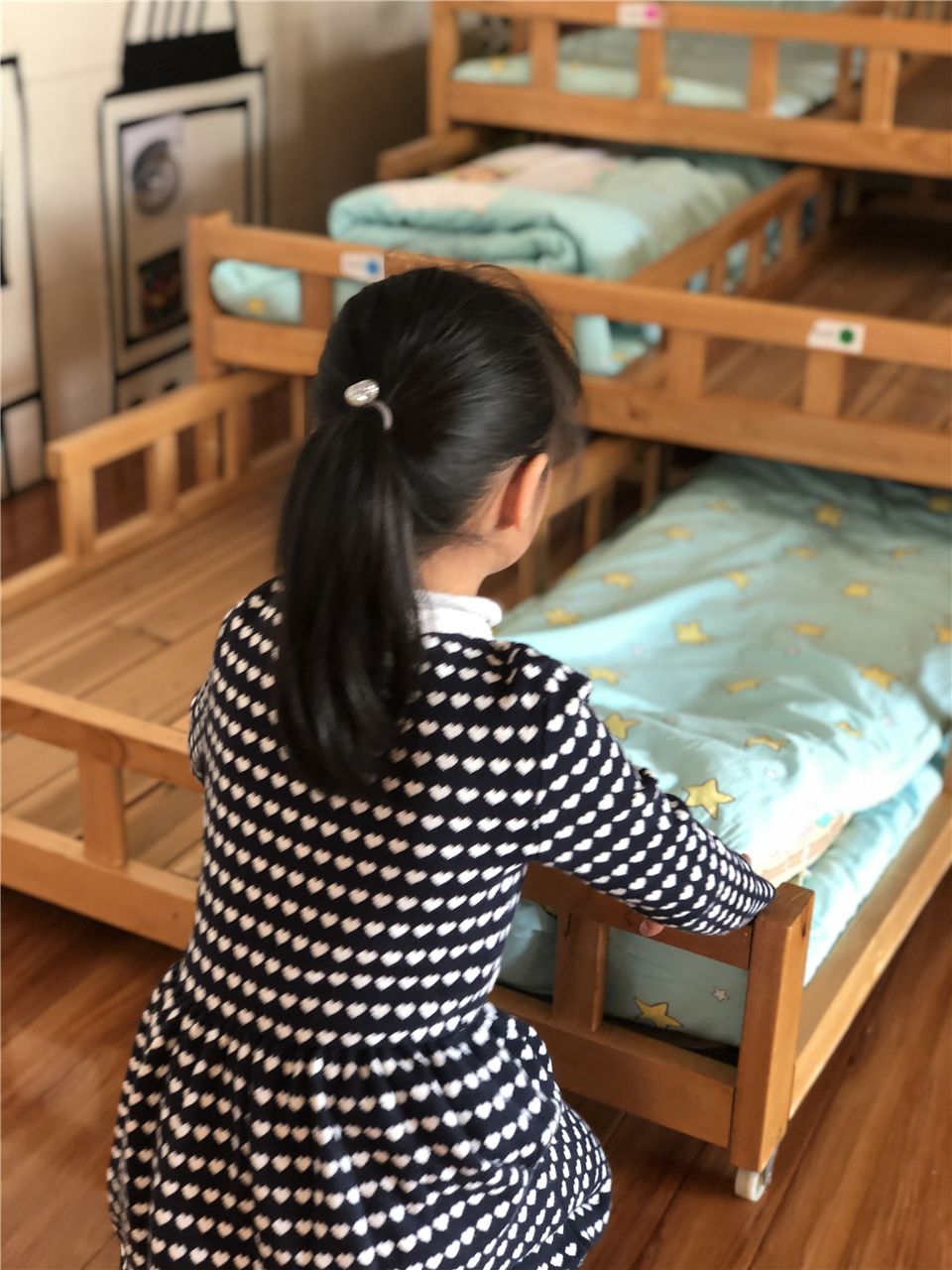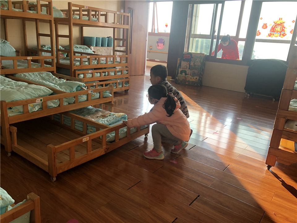 早上来园把消毒好的床收进去,要午睡罗,我们再把床拉出来吧。
