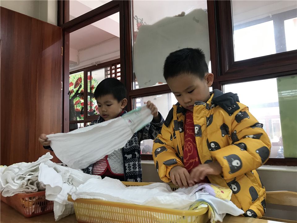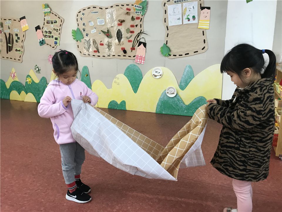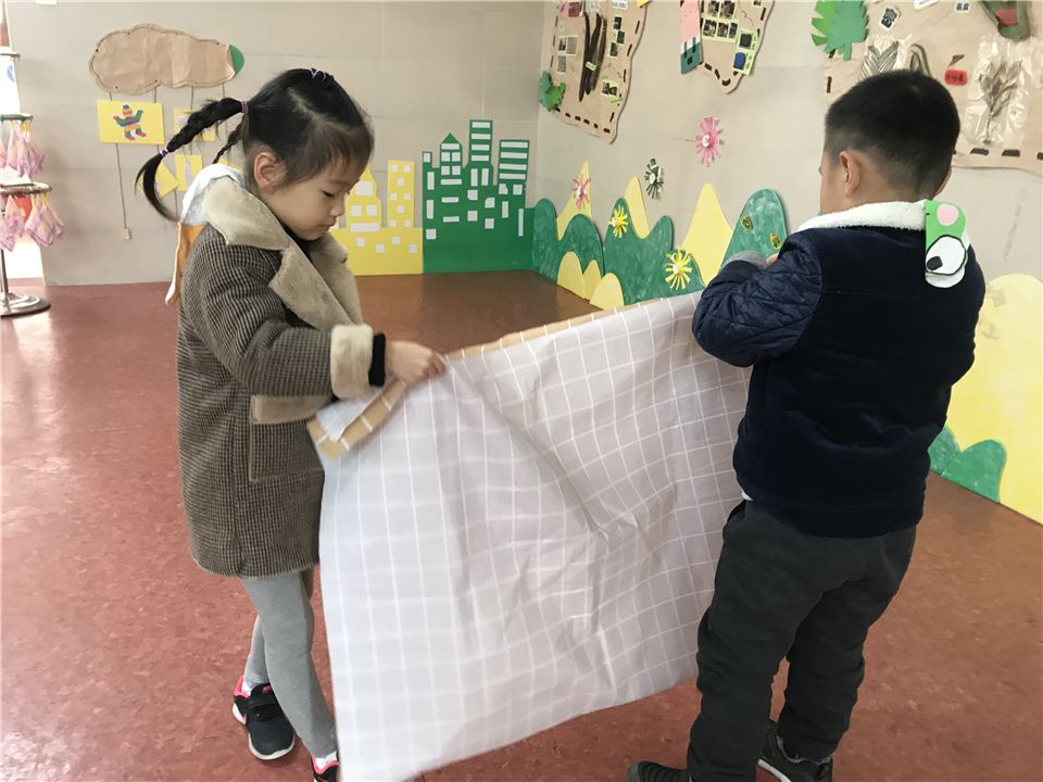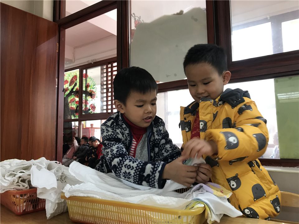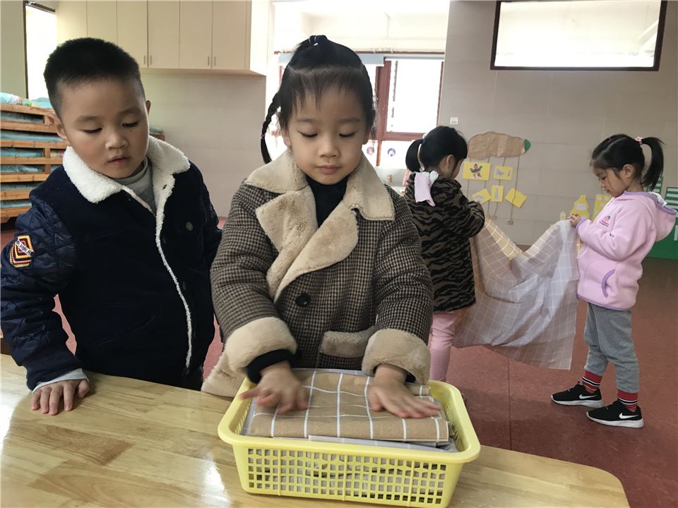 “我拉这头,你拉那头,我们角对角、边对边。一次两次三次,这大小刚刚好,不会从框里跑出来了。”原先凌乱的游戏材料,在小朋友的细心整理下变得井井有条。