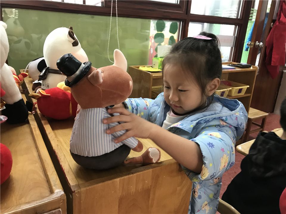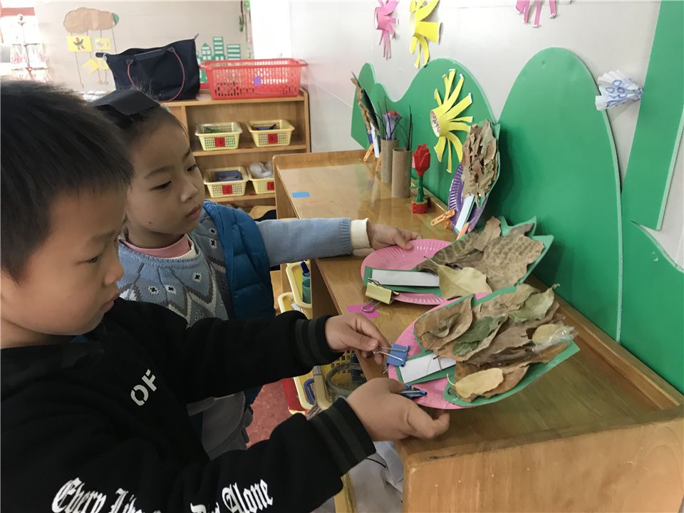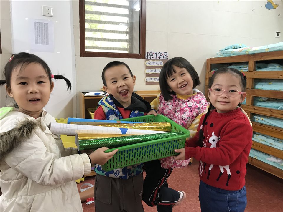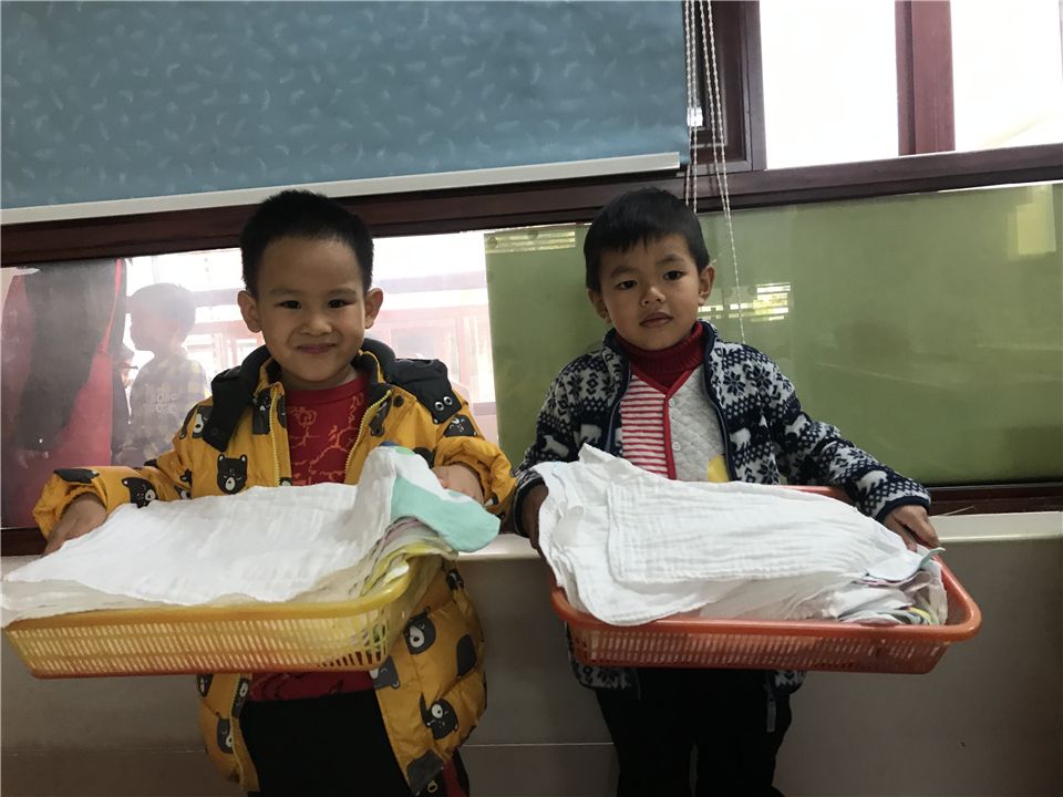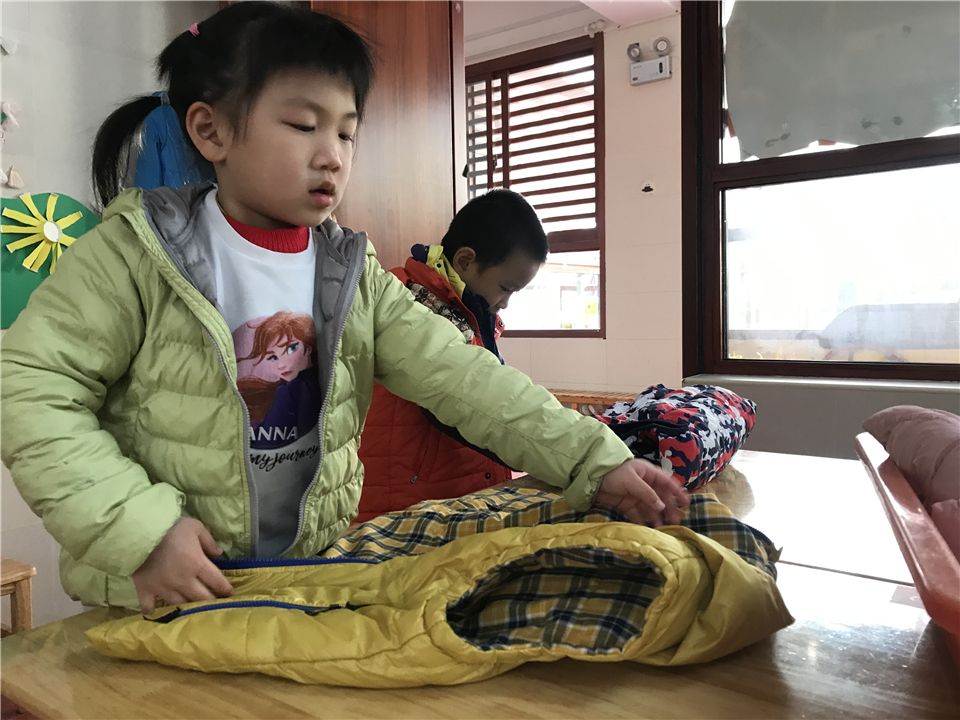 “我拉这头,你拉那头,我们角对角、边对边。一次两次三次,这大小刚刚好,不会从框里跑出来了。”原先凌乱的游戏材料,在小朋友的细心整理下变得井井有条。