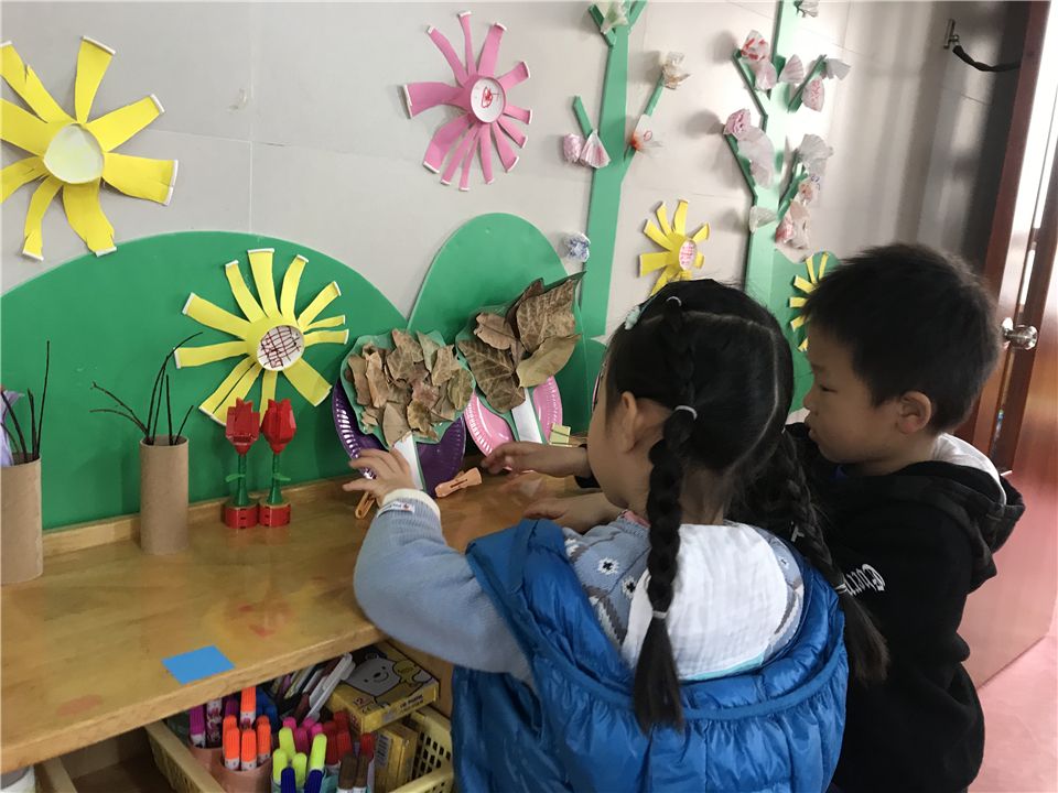 淇淇和小海商量着一起摆放美工区上的幼儿作品。“这么漂亮的画让他躺下了多可惜,让我来把小朋友的作品摆摆整齐。”