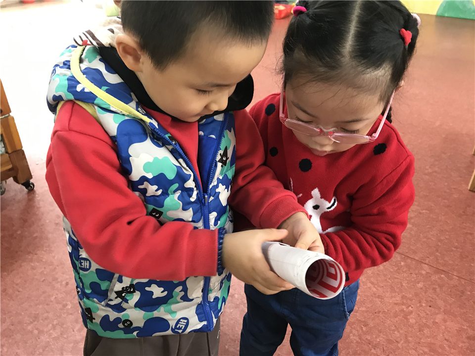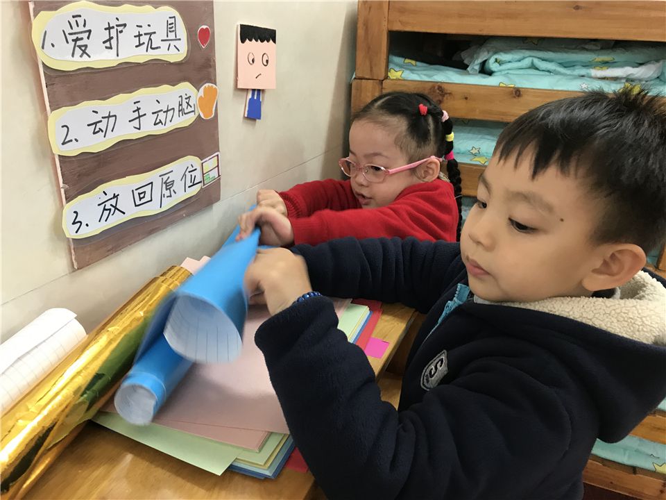 “我们一起合作,你抓住纸卷我来贴,这样纸张不会跑了。”天天和月儿互相帮忙完成任务。