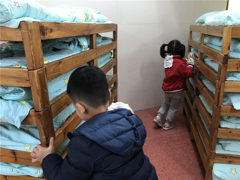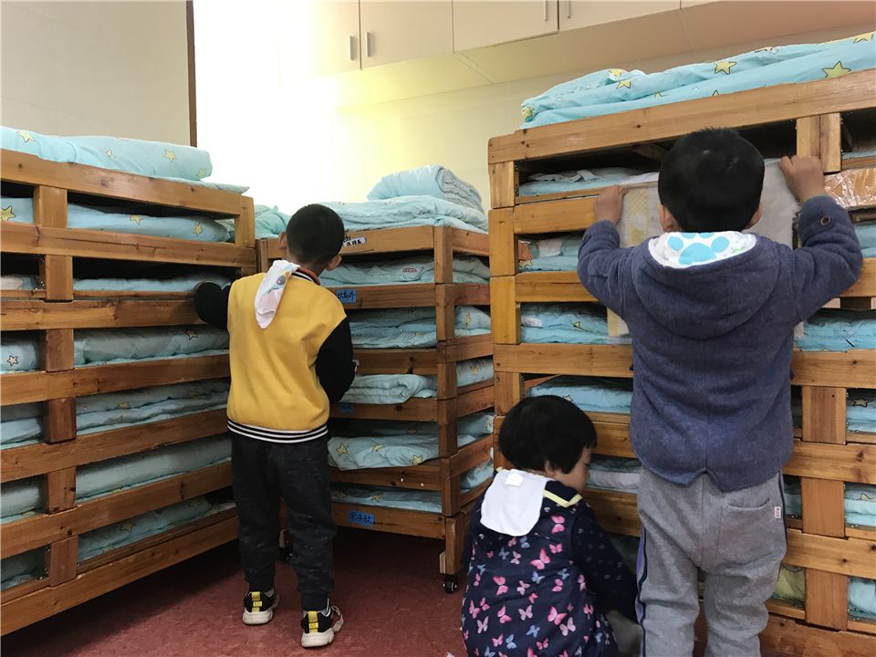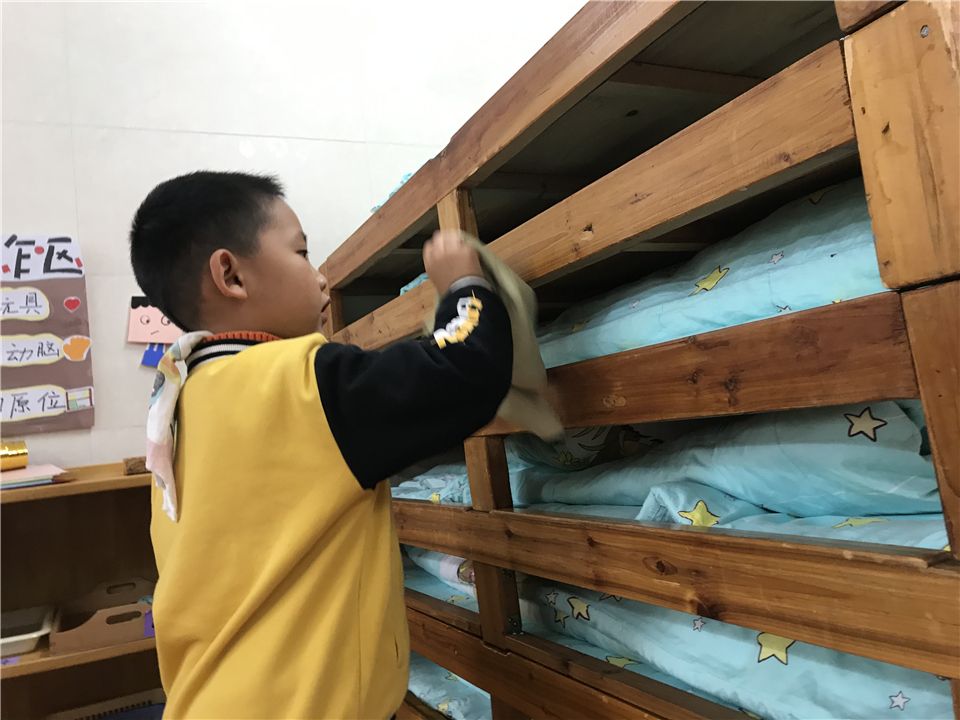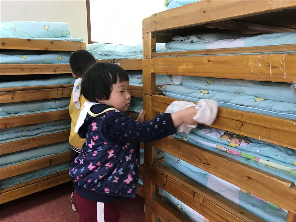 “班级的床铺每天搬搬抬抬会沾上灰尘,让我把它的边边角角擦干净,这样小朋友就可以睡得香香的了。”宝宝、南南等一群小伙伴正在仔细的擦拭床沿。
