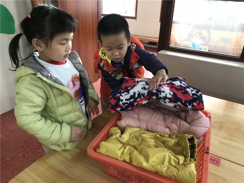 衣筐也是班级的重灾区。 “小朋友们衣服叠的不够整齐,让我们来帮帮他吧。左边一件右边一件,我们是叠衣小能手。”细心的乐乐和欣欣帮小朋友们将衣服摆放的整整齐齐。