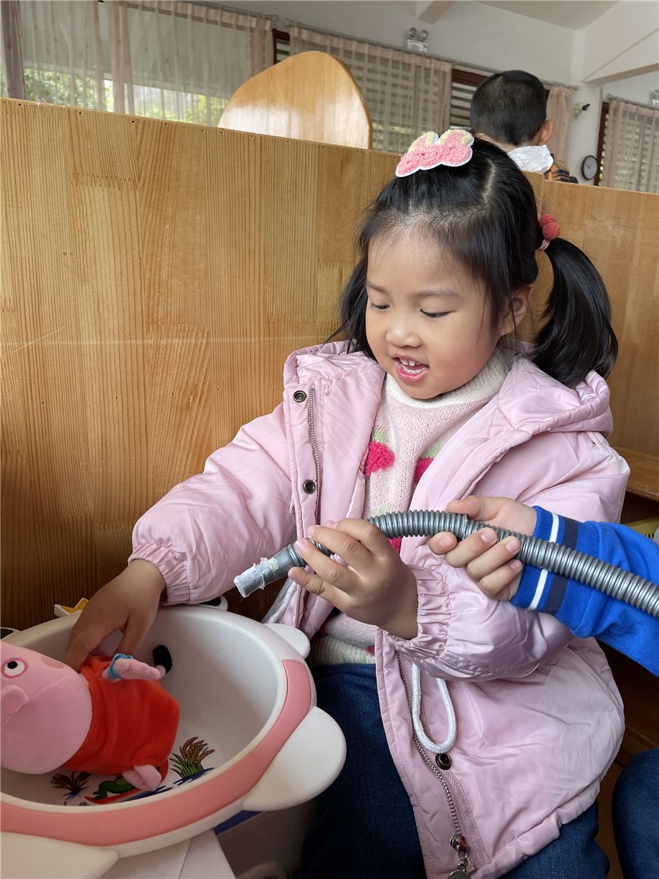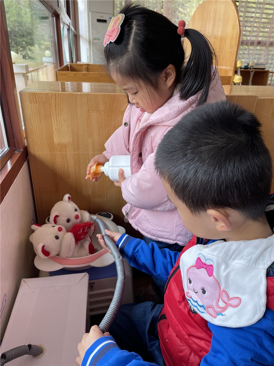 若溪、子骞细心的为小动物洗澡、做美容。