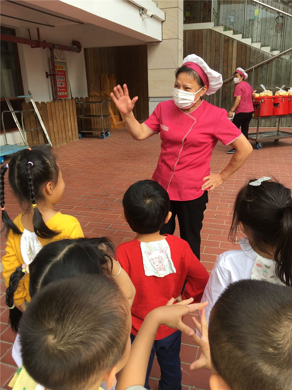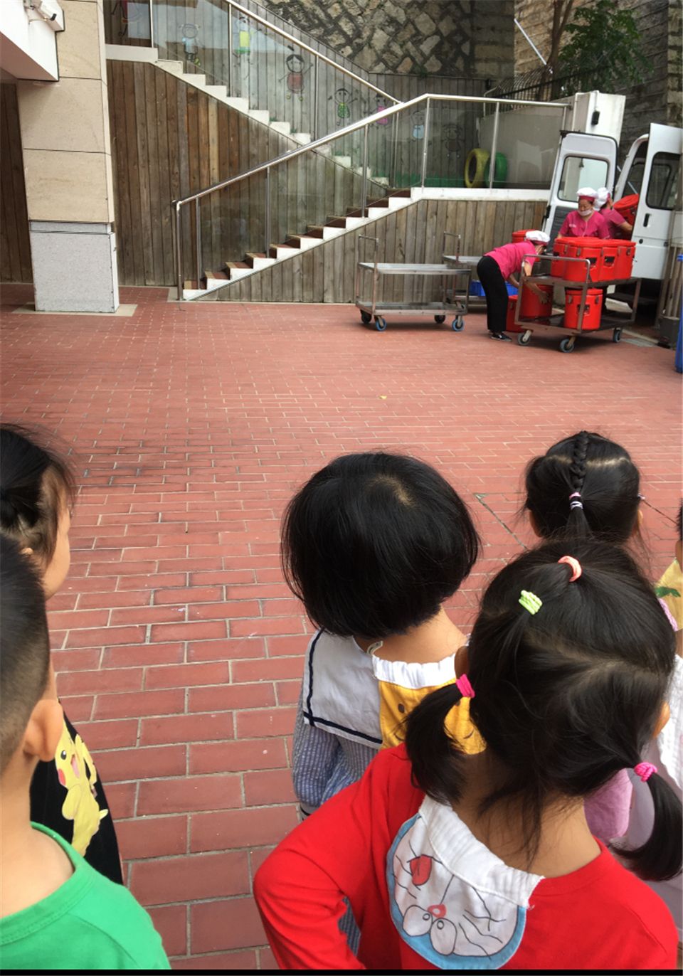 随后,洗消间的阿姨告诉孩子们:一会儿送餐的阿姨就会送早点过来了。滴滴滴,我们幼儿园的专属餐车开来啦!老师组织孩子们在距离餐车有一段安全距离的地方观看送餐阿姨在搬早点的情境。当送餐阿姨搬完早点后,孩子们忍不住要提问了。