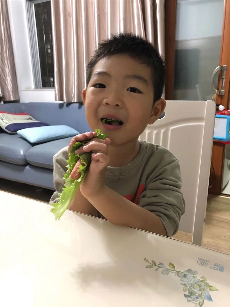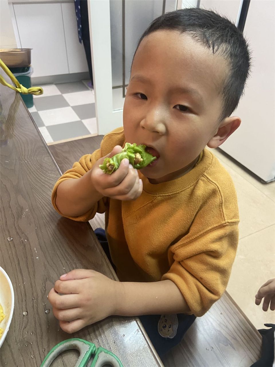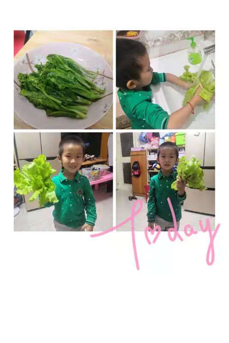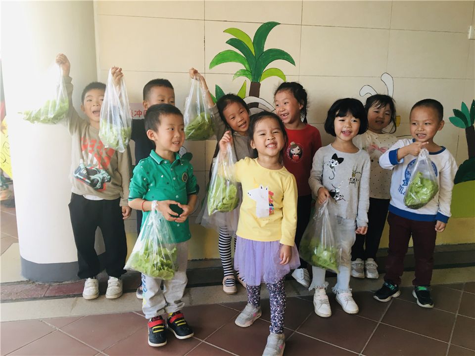 初冬时节的傍晚,一群孩子如获至宝似地开心从幼儿园提着一袋袋绿色蔬菜回家,这是怎么回事呢?原来是中五班的孩子们在开心农场上种植的生菜成熟了,她们要把这丰收喜悦和爸爸妈妈一起分享。回到家后,孩子们迫不及待地把生菜变成了一道道美食:有爆炒生菜,有牛肉生菜汤,还有生菜面等等。孩子们一个个吃得津津有味、很是满足,仿佛是吃到了人间最美味的食物。