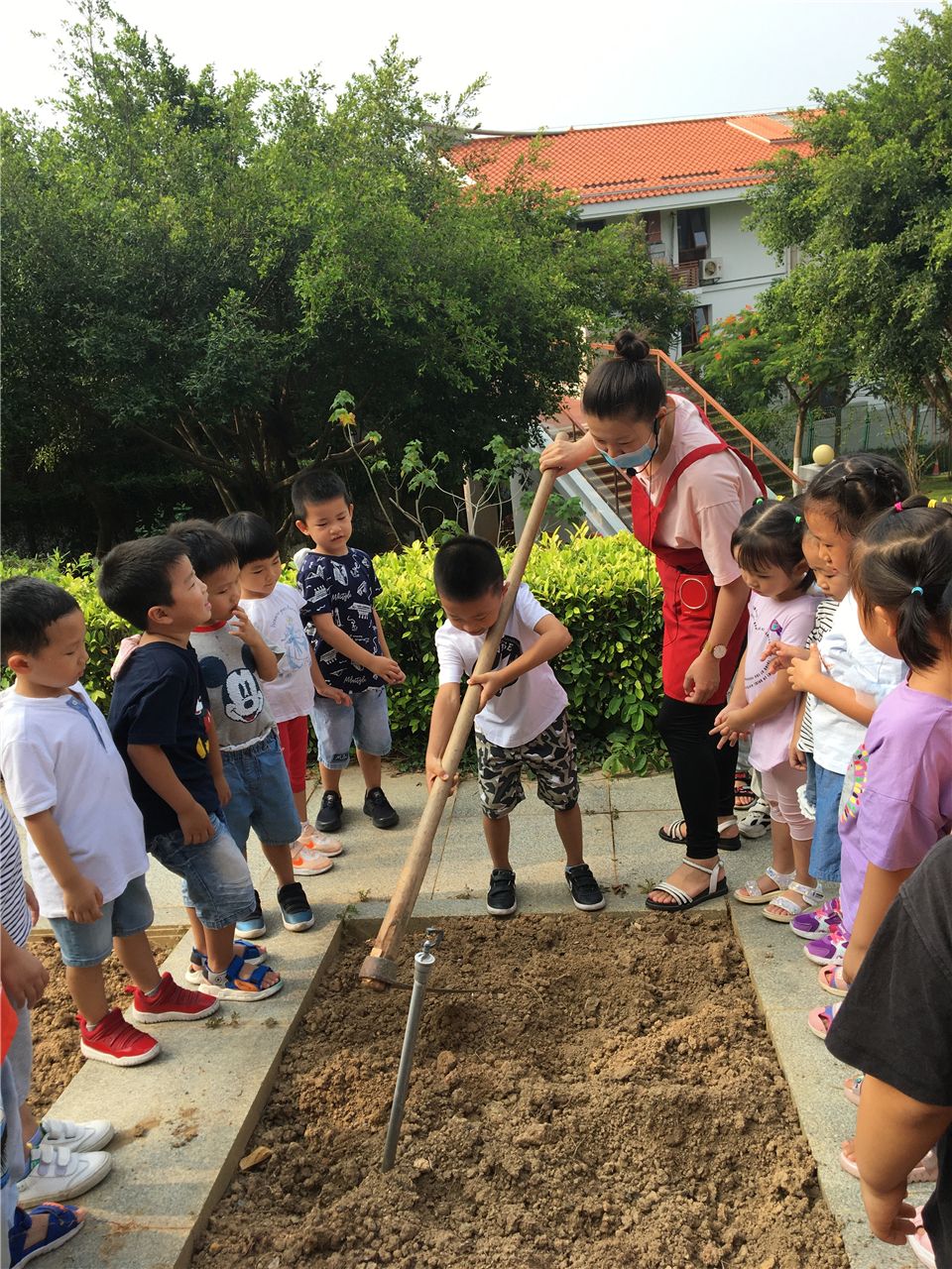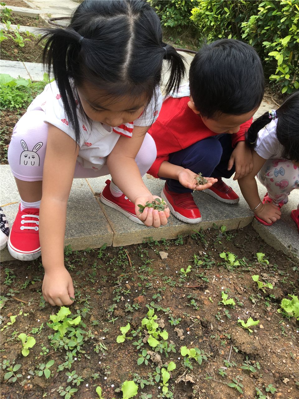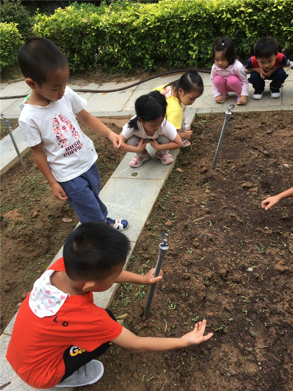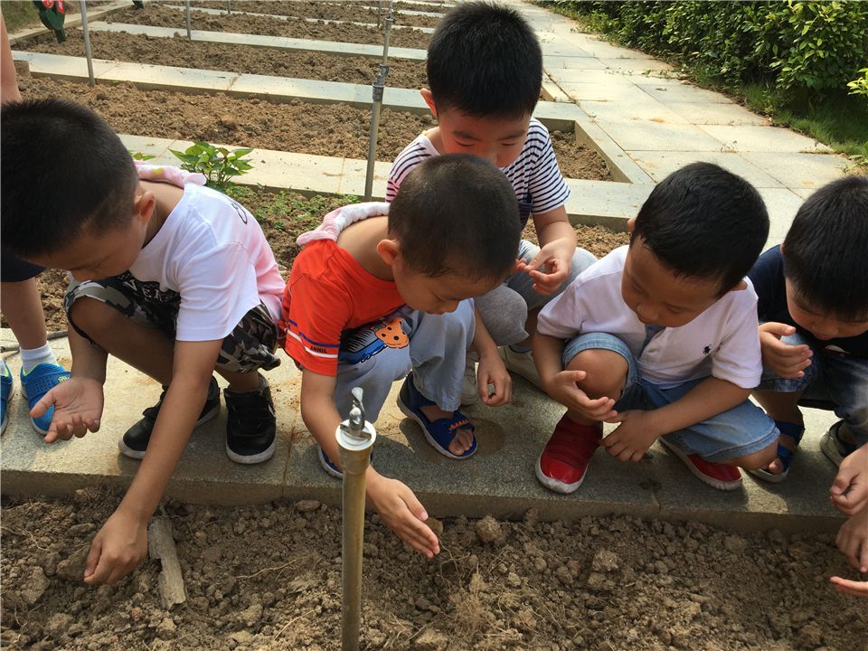 开学初,孩子们在老师的带领下就开始给专属班级的一畦菜地进行松土了。孩子们争先恐后地来体验了一把拿着锄头松土的感觉,原来拿着锄头松土是要很大力气的,很是辛苦。要开始播种了,看着手心里的一粒粒小小的菜籽时,孩子们讨论起来了:“这个菜籽像芝麻粒”“不对,这个籽像一根根刺”“它有眯像饼干屑”……随后,有的孩子小心翼翼地将菜籽撒到菜地上,有的孩子则轻轻地地菜籽上盖上一层薄薄的土,还有孩子负责给菜地浇浇水。在种植中,孩子们丝毫没有顾忌额头已沁出汗水和小手上沾满的泥土,依然很是快乐地播种着。