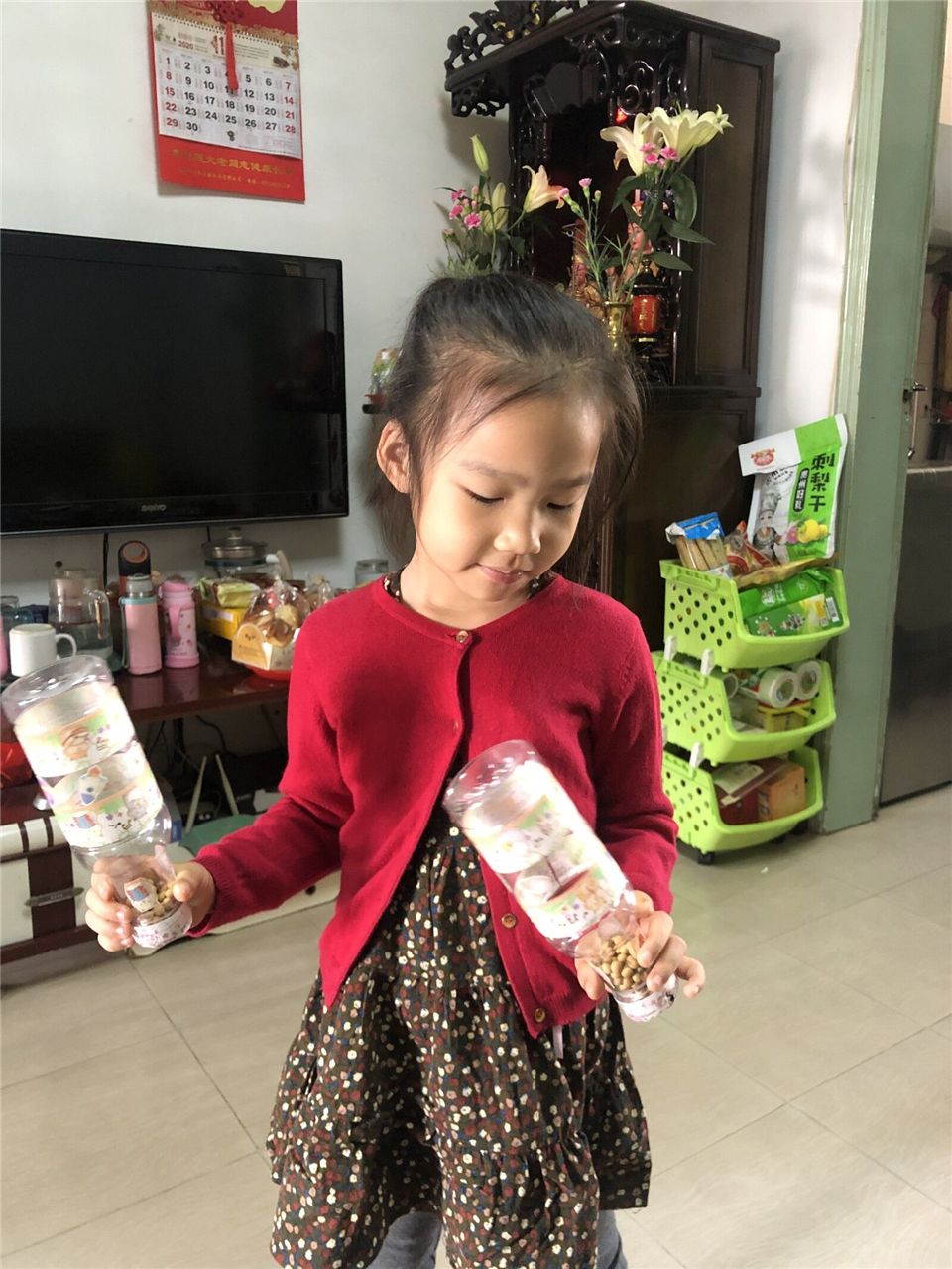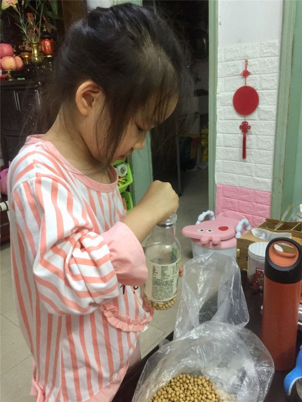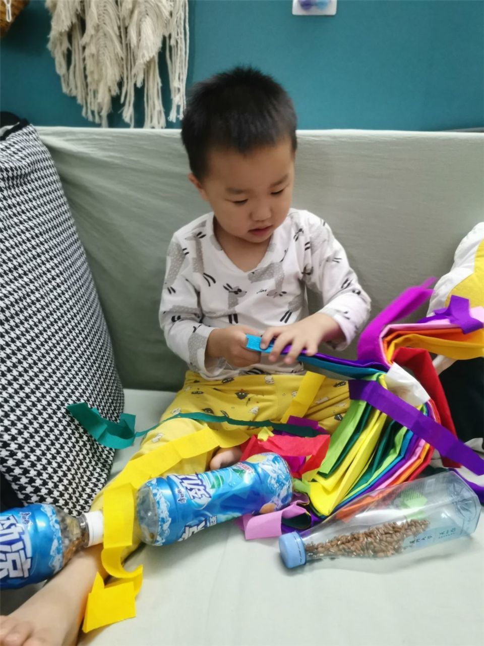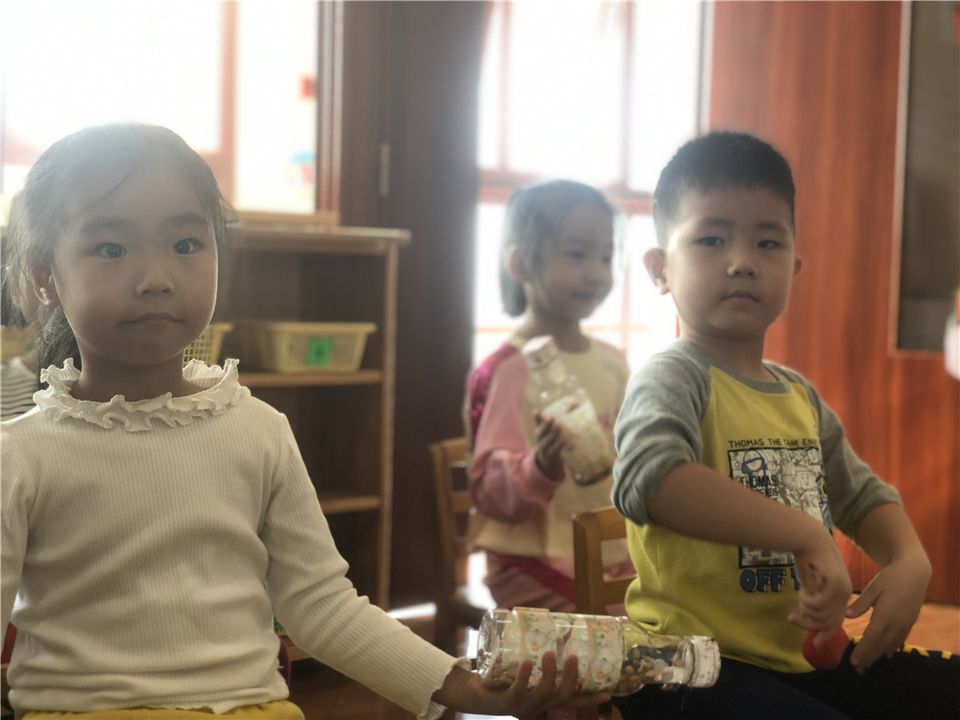 给矿泉水瓶装上小黄豆,沙沙沙,真好听!