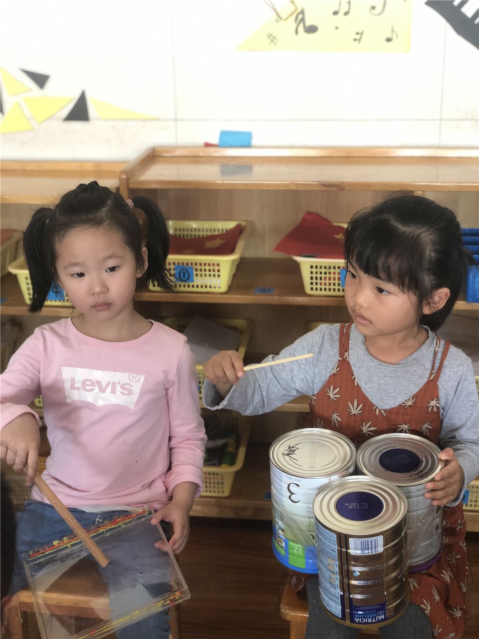 答案是肯定的。瞧!区域活动时,音乐区里我们自选小乐器,自己按照歌曲粘贴节奏型,自己伴奏。