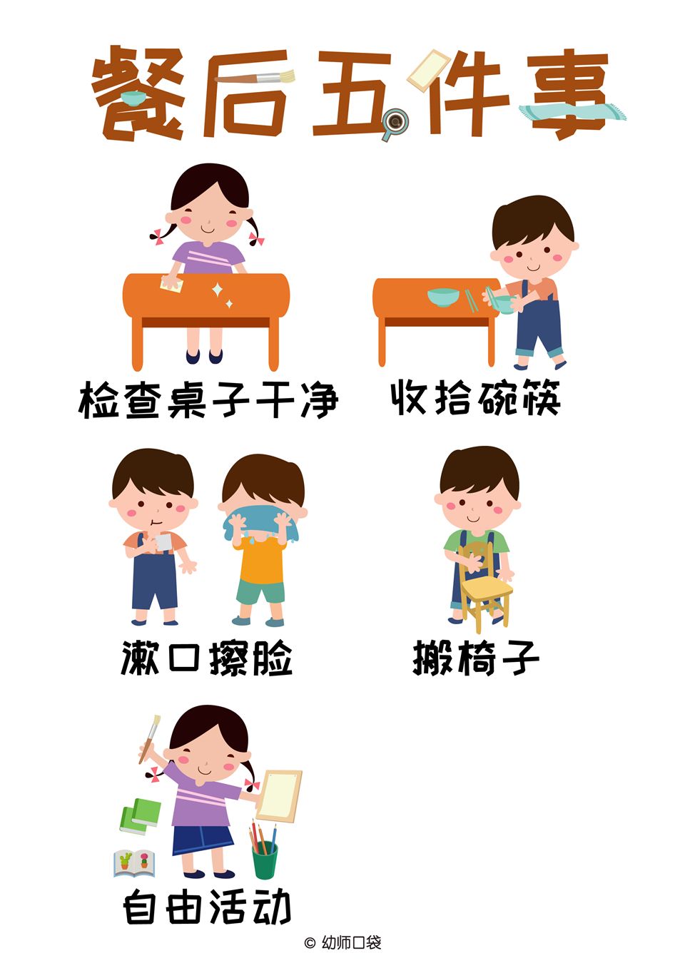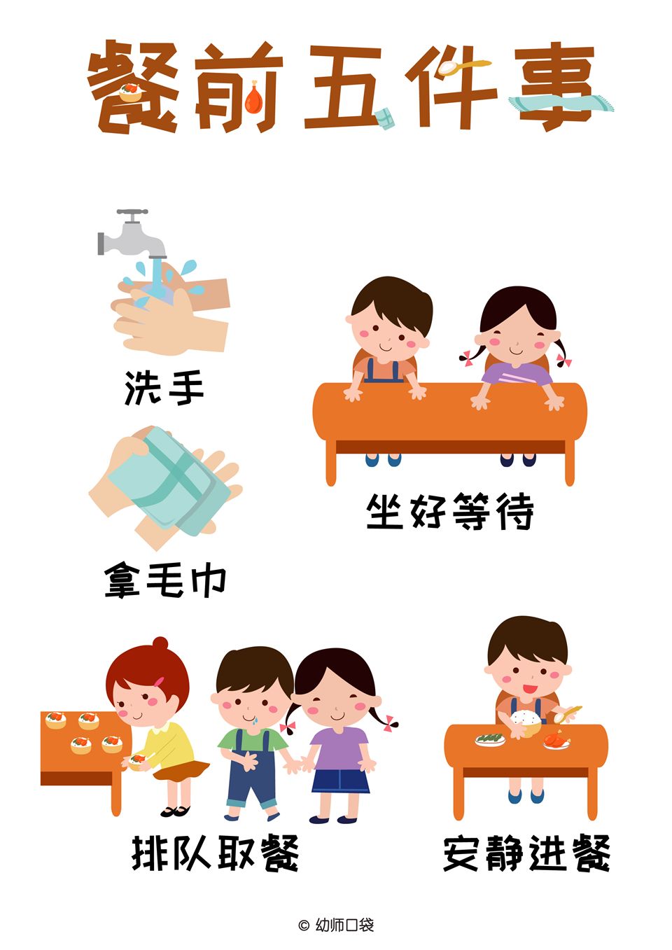 餐前、餐后五件事是什么呢?进餐文明礼仪从我做起。