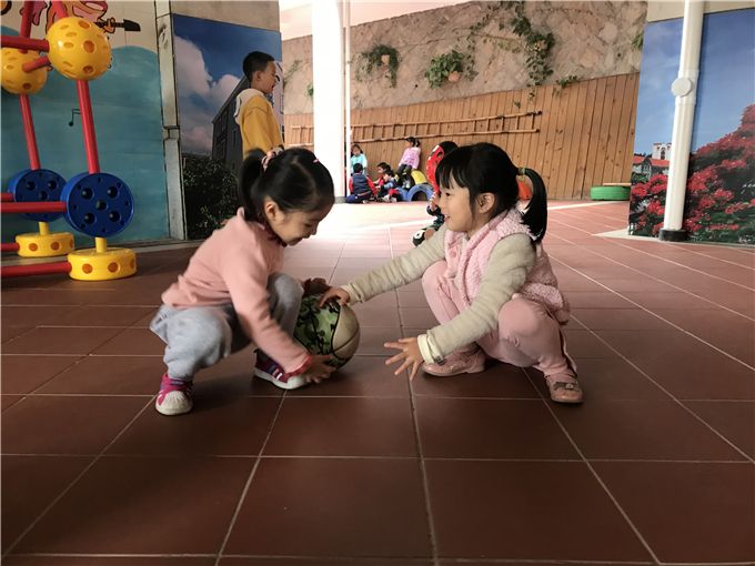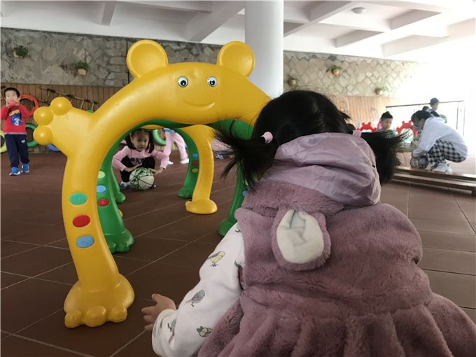 几个宝贝玩起了互相传球的游戏。他们围成了一个大圈,投放三五个小球,我滚给你,你滚给我,既要看着传递的人也要盯着传球给你的伙伴,哈哈哈!小球溜走时幼儿们乐得开怀大笑。