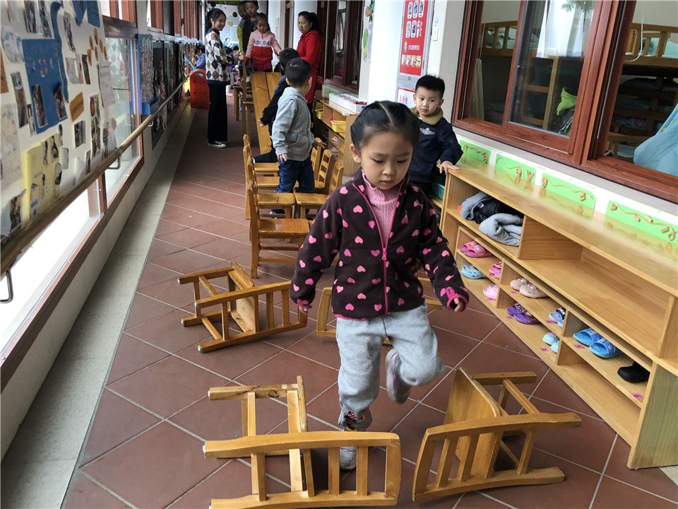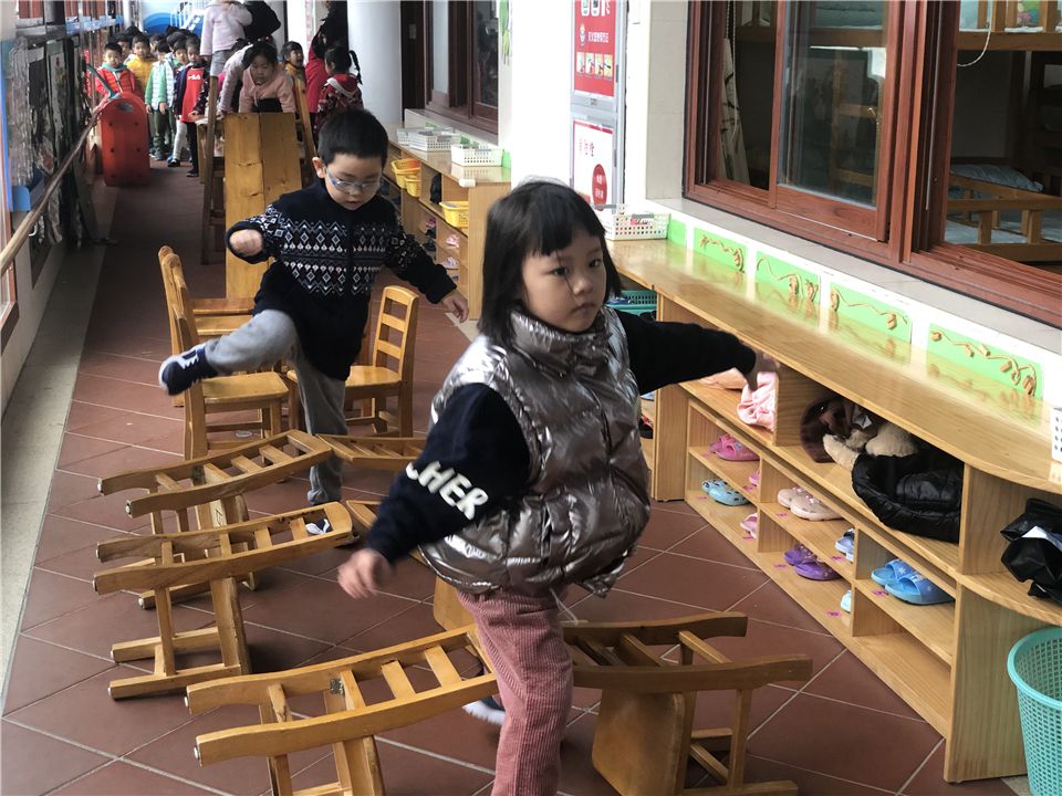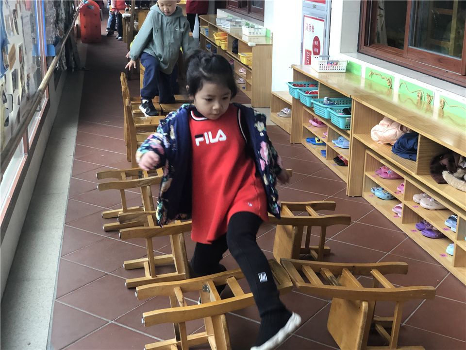 户外玩具材料“袋鼠跳”与班级的小椅子完美结合,小朋友们自己设计的关卡规则使闯关游戏更附有趣味性。