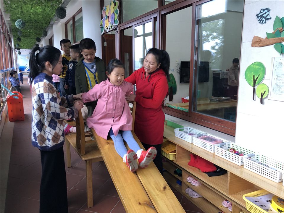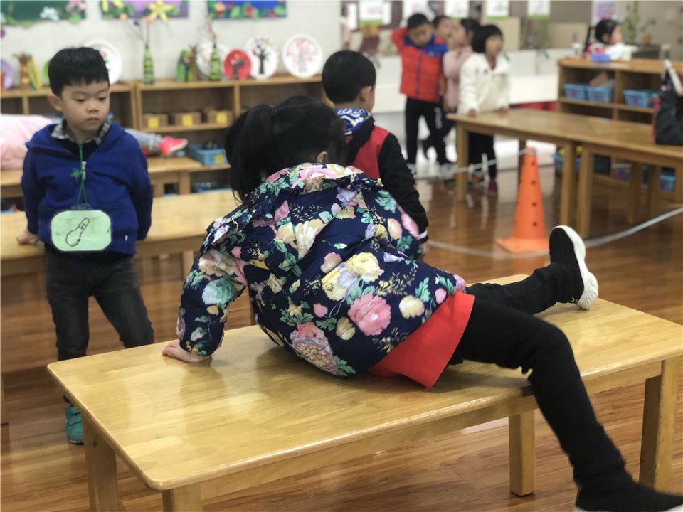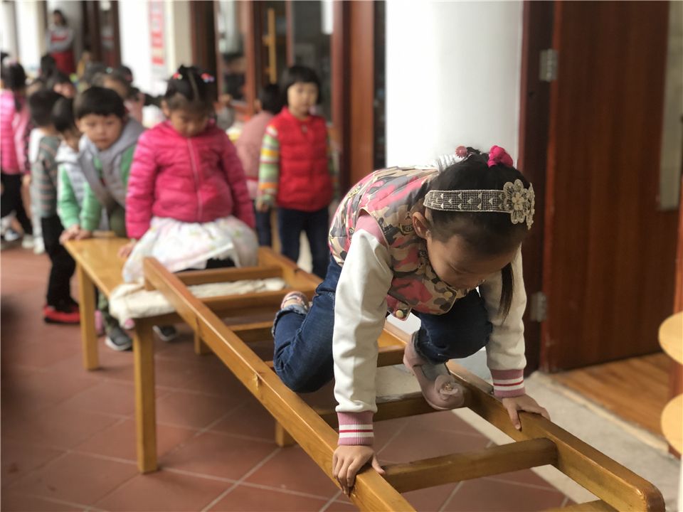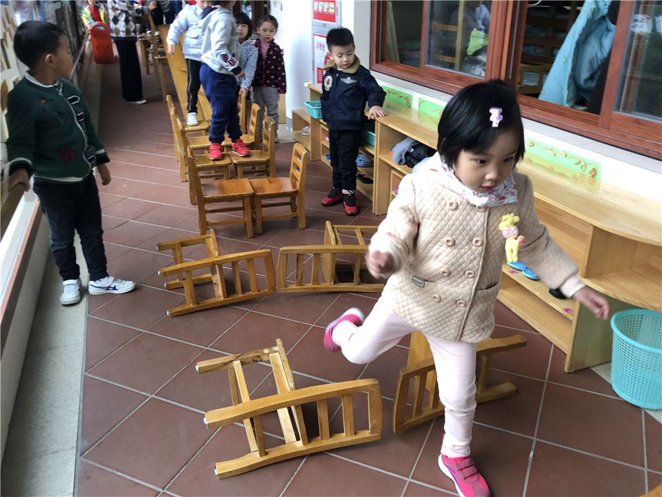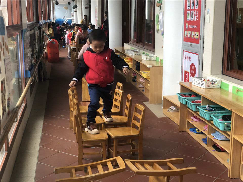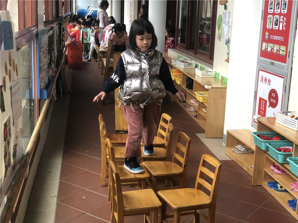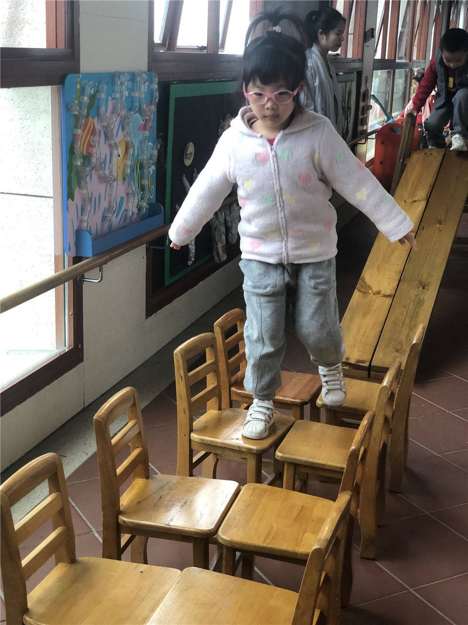 “快跟我一起走过“椅子独木桥”,跨过障碍物!”