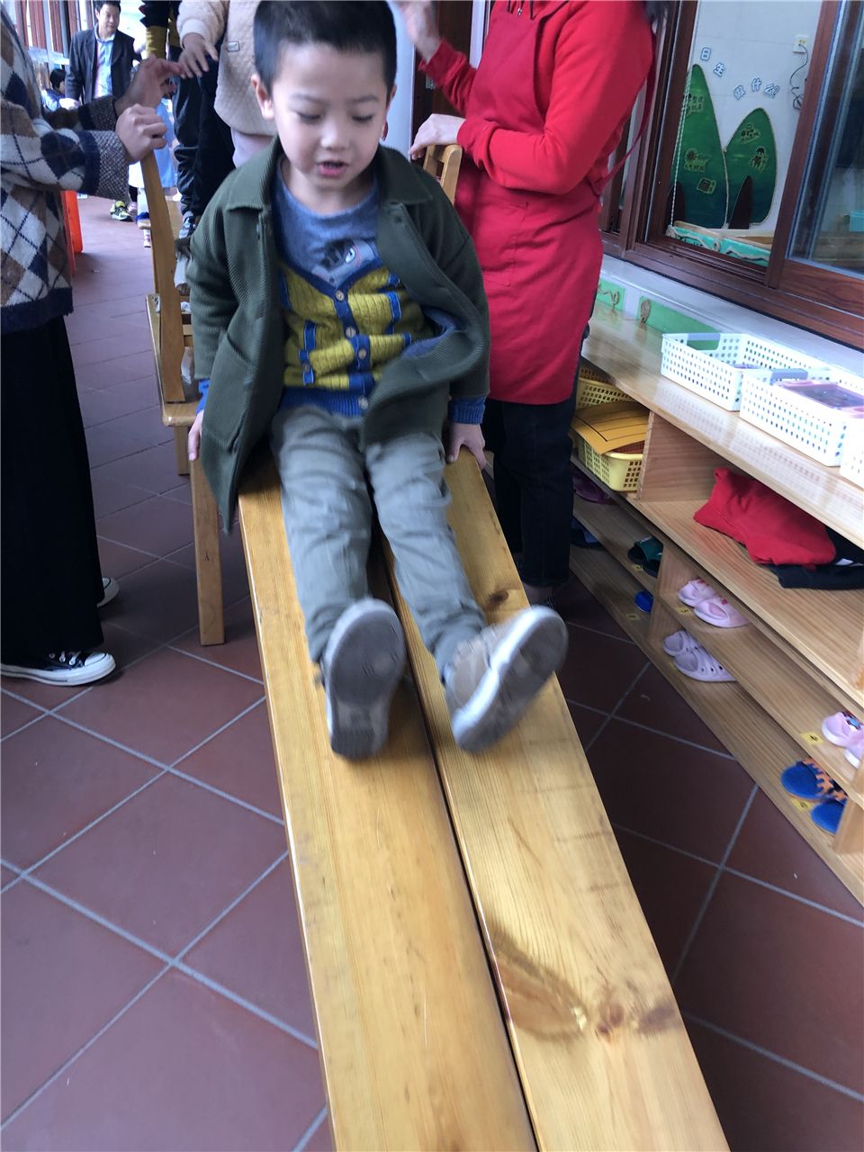 “哎呀!把木板架在桌子上不就成了滑滑梯了吗?”