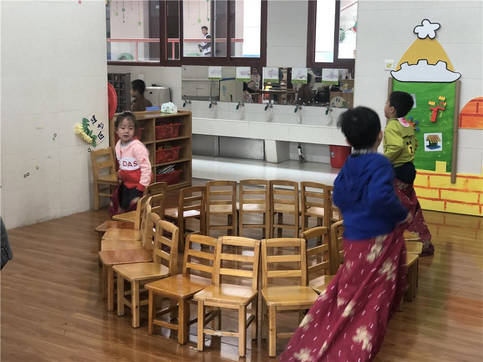 “把椅子围成圆,绕着袋鼠跳一圈才算过关哦~”